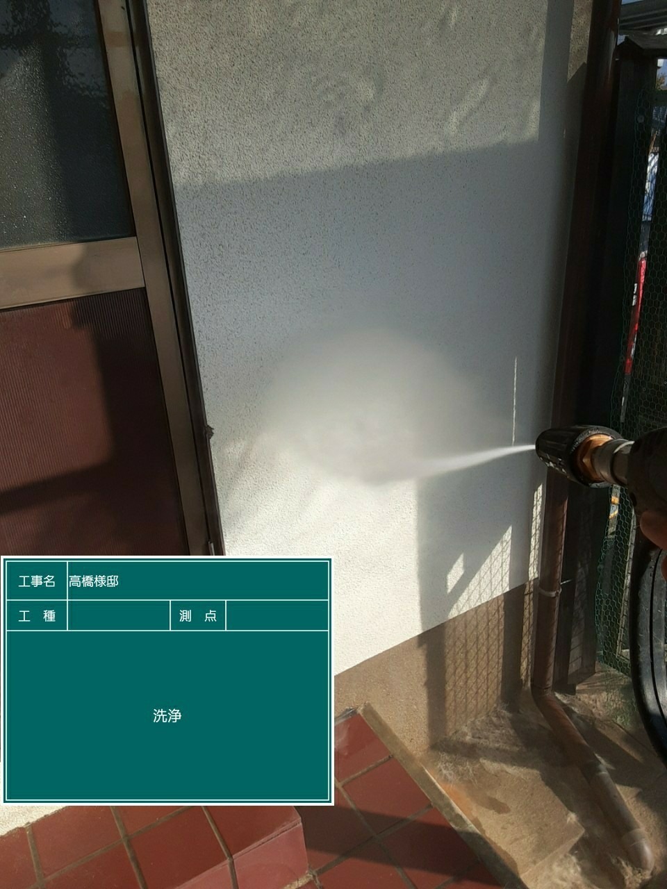 高圧洗浄にて塗装箇所に付着したコケや汚れなどを取り除いていきます。