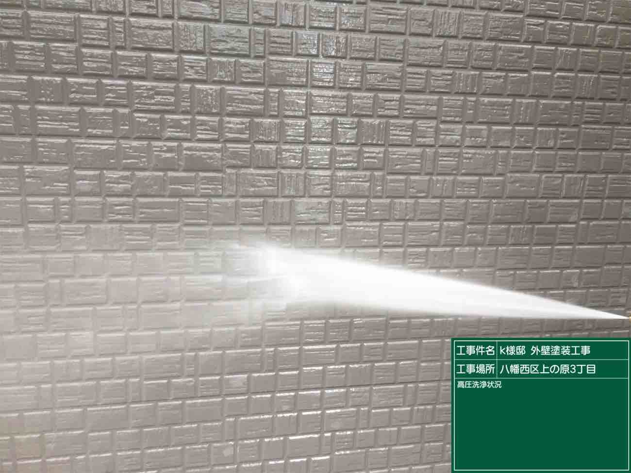 外壁洗浄作業を行います。外壁に付着している汚れを落としていきます。