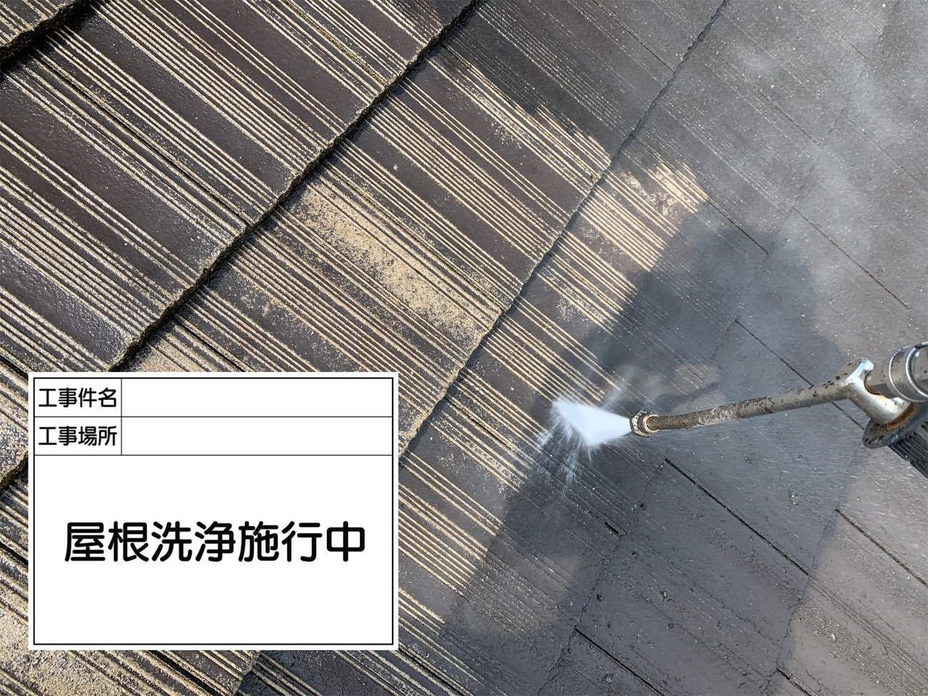 屋根についた汚れを洗い流していきます。 ここでしっかり洗い流さないと、上からいくらいい塗料を塗っても 剥がれてしまいます。