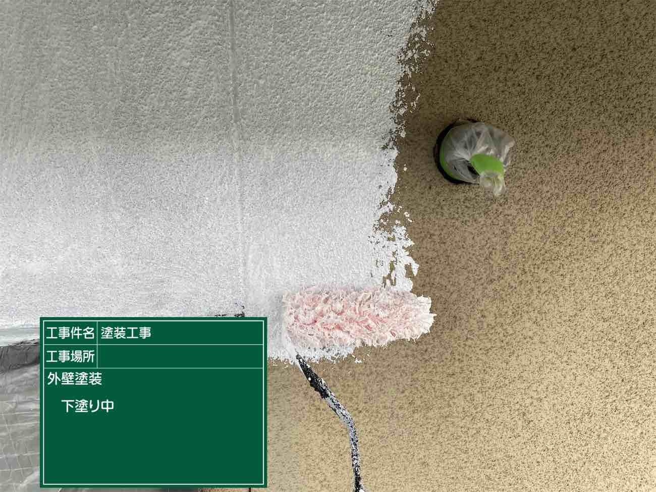 外壁の下塗り作業です。下塗りで密着性を高めます。
