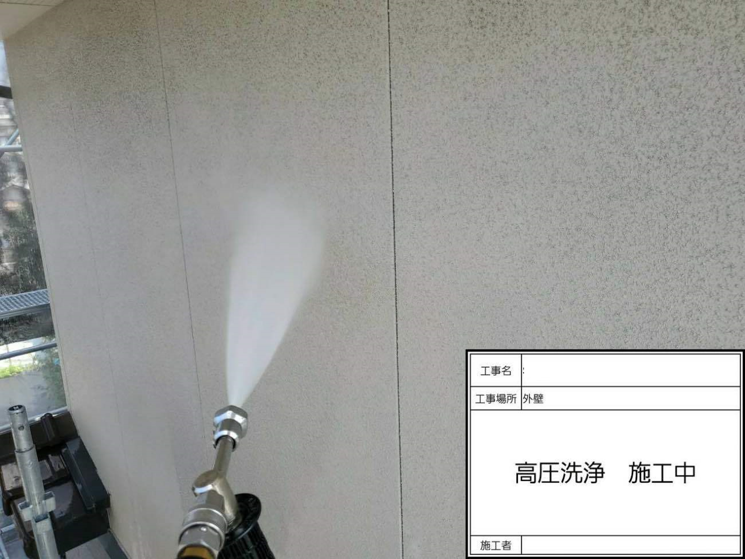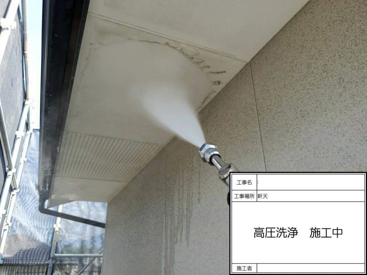 塗装リフォーム工事の始まりは高圧洗浄作業です。隅々まで洗浄していきます。