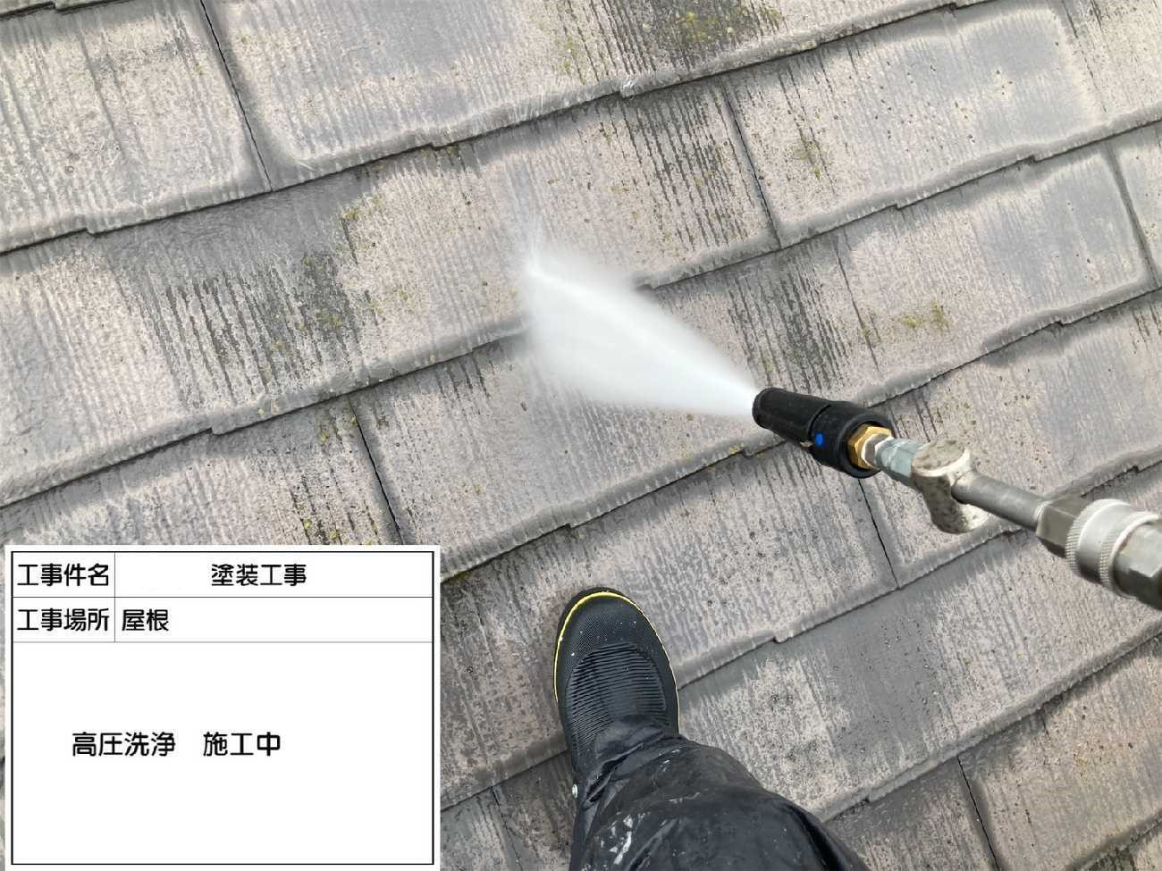 屋根の汚れを高圧洗浄で洗い流していきます。