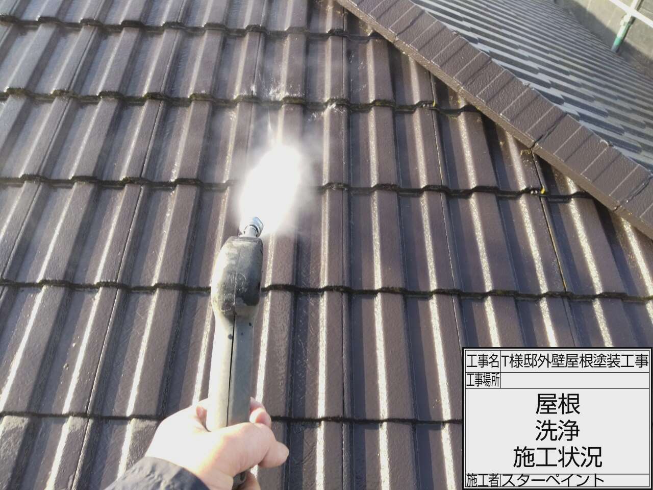 屋根の洗浄作業の様子です。高圧洗浄機を使用し屋根をきれいにしていきます。