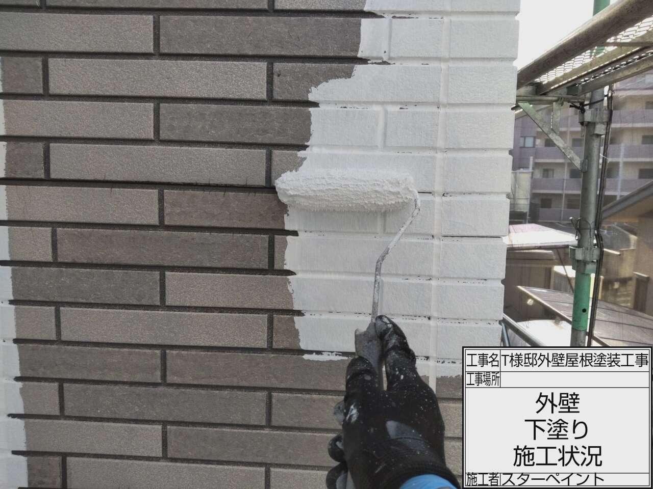 外壁の下塗り作業です。 下塗り作業をおこない、外壁の下地と塗料の密着性を高めていきます。
