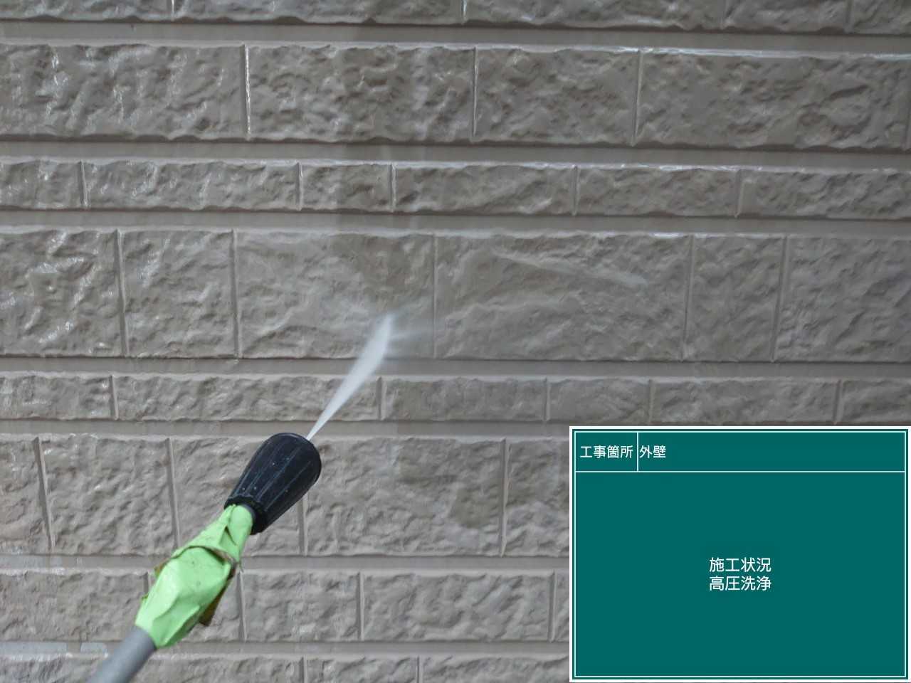 外壁も同様に高圧洗浄していきます。洗浄を行うことで、きれいにし塗料が密着しやすくなります。
