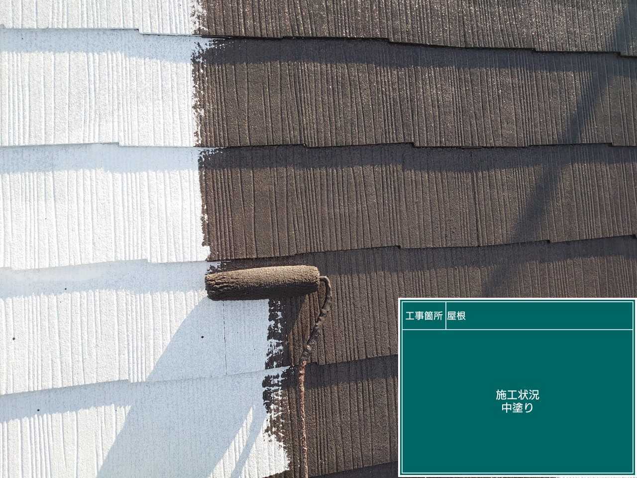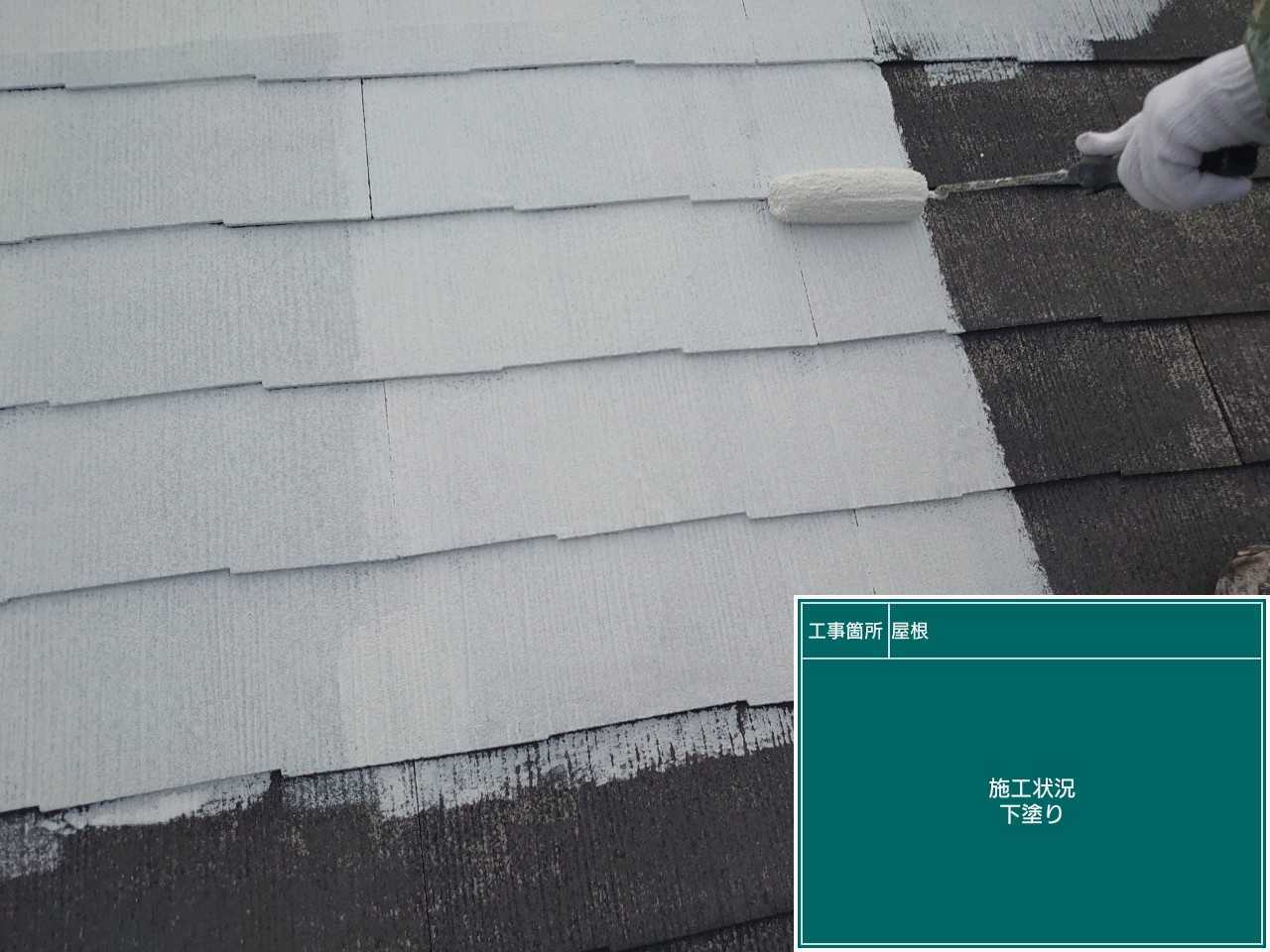 屋根の塗装作業です。まずは下塗り塗装作業からです。下塗りは上塗り塗料の密着性を高めていきます。