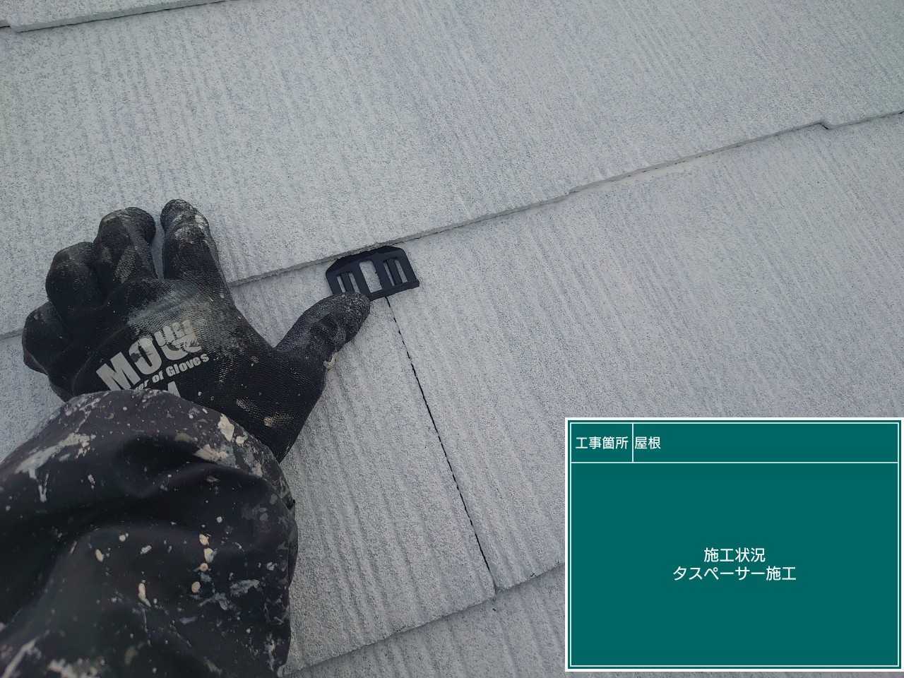 屋根材との間にタスペーサーという縁切りの道具を差し込基材との間に空気の通り道を作ります。