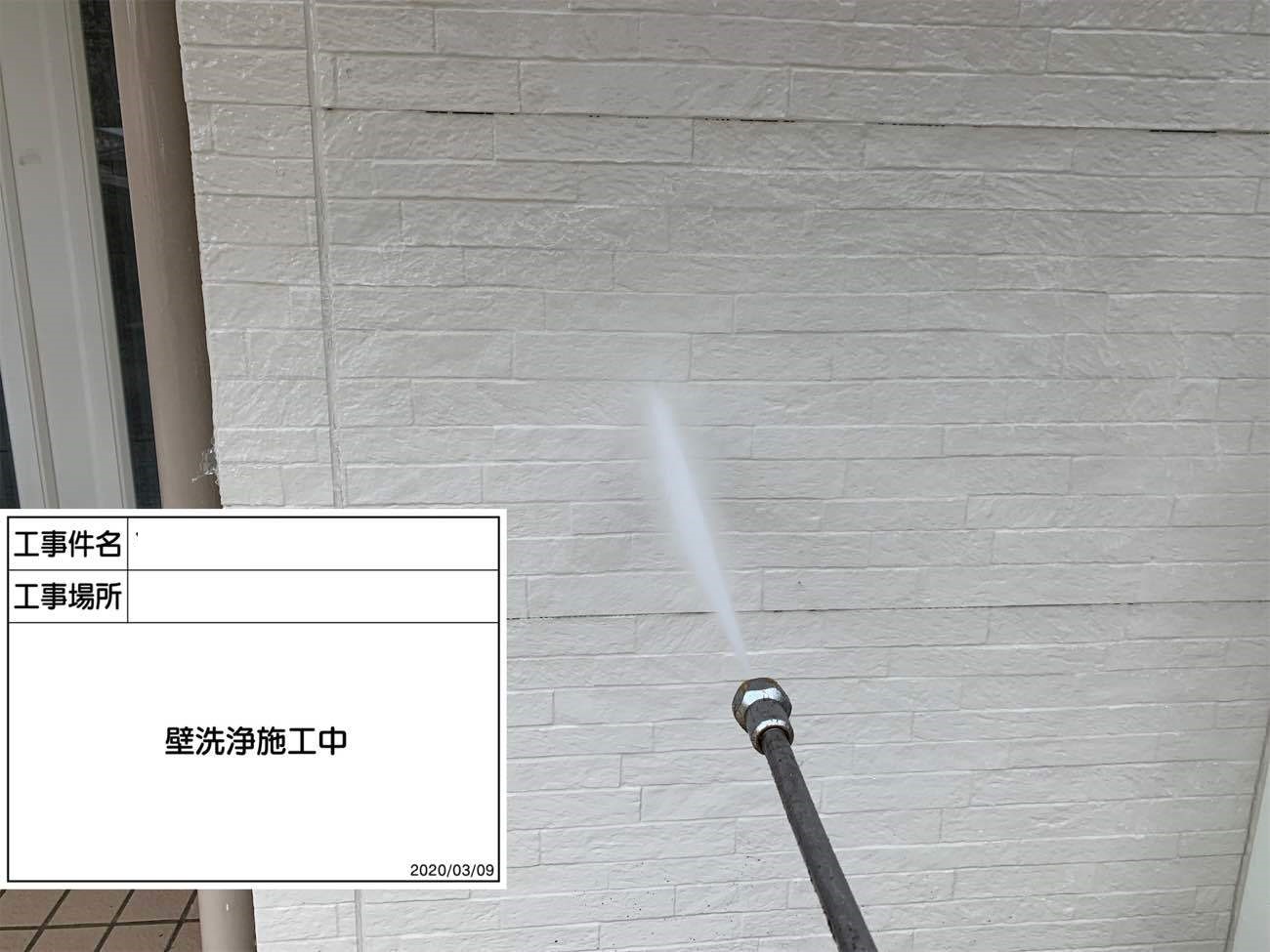 外壁についてる汚れを高圧洗浄で洗い流します。 強力な洗浄なので、しつこい汚れも綺麗に落とせます。