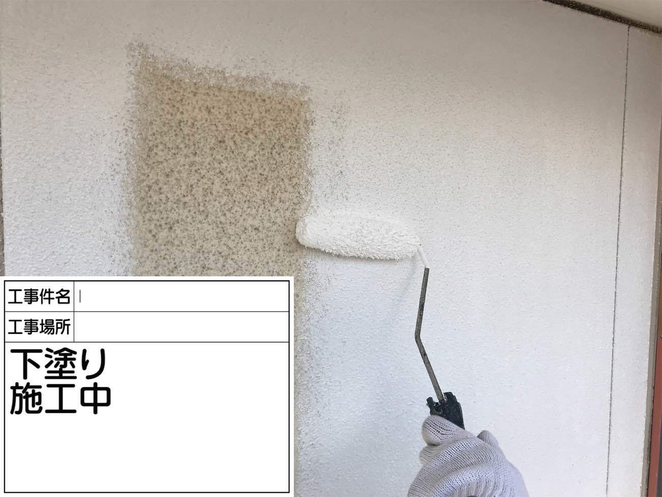 外壁は下塗りから塗っていきます。 下塗りは、上から塗る塗料との密着性を高めてくれます。
