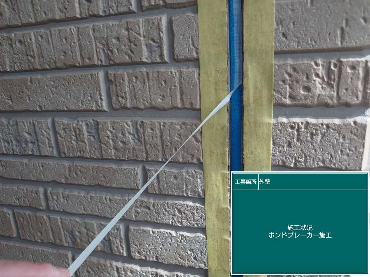 目地の底にボンドブレーカーを接着していきます。ここで3面接着を防ぎ、耐震性を強化していきます。