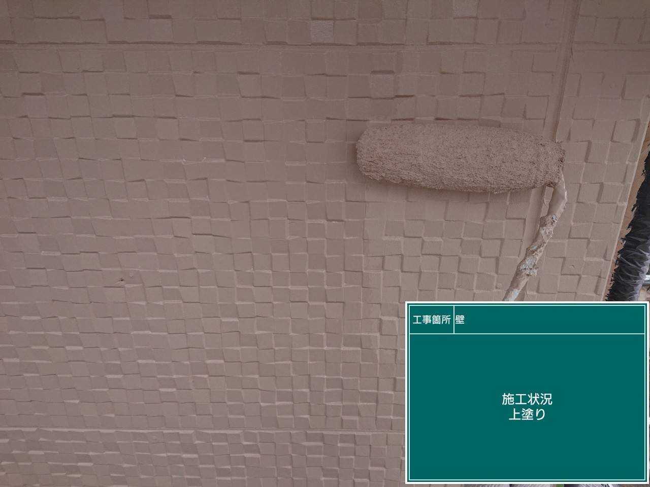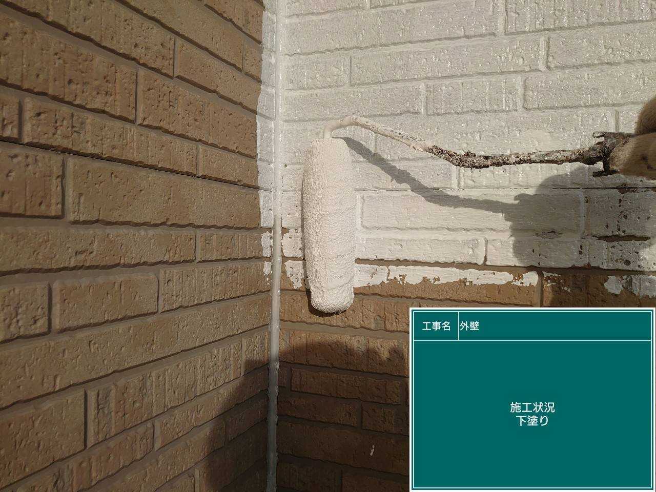 充填が完了したら外壁の塗装を行います。 まずは下塗り作業。下塗りで下地と上塗り塗料の密着性を高めていきます。