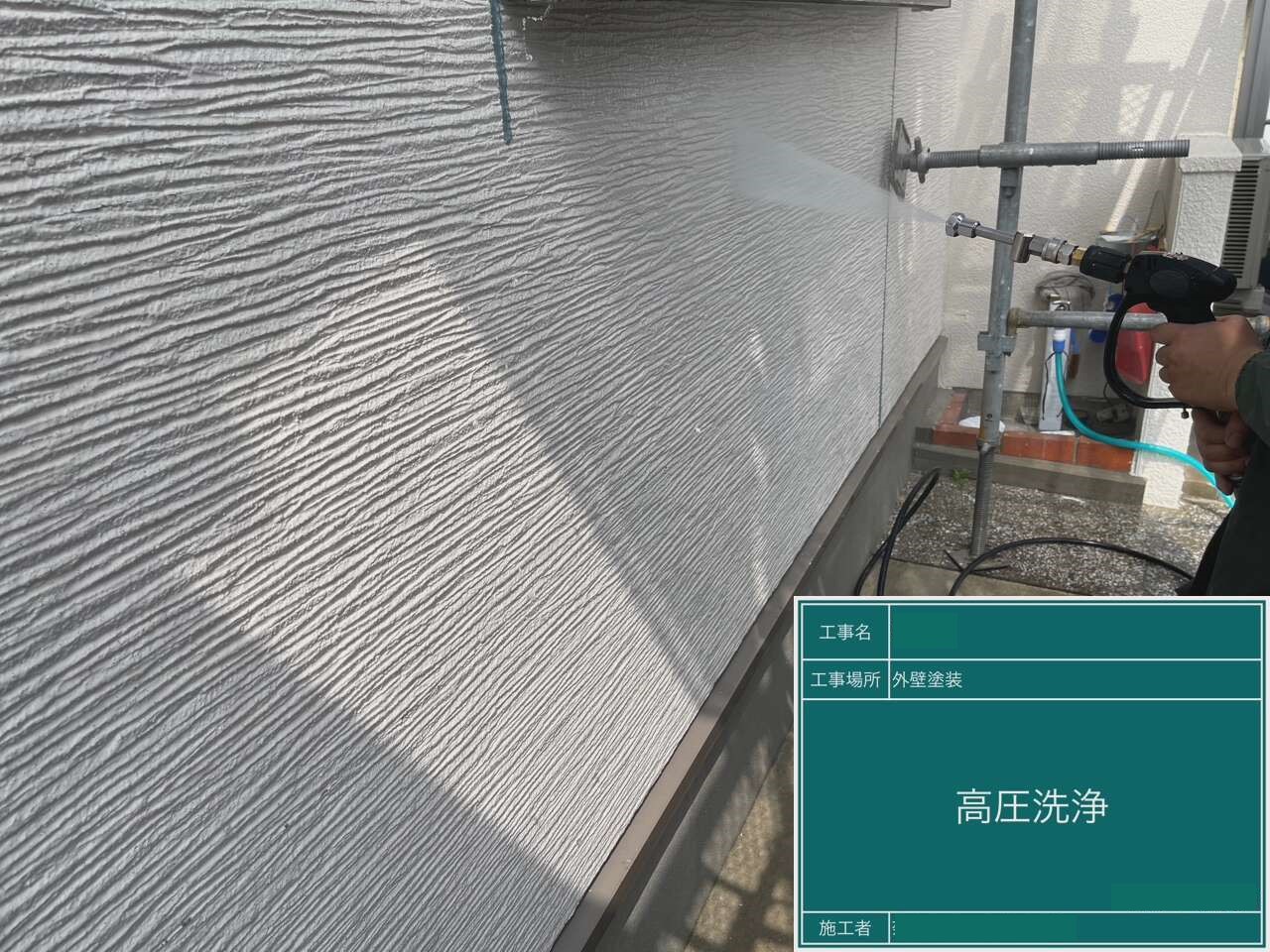 外壁についた汚れを洗い流していきます。 強力な洗浄機で洗い流すので、細かい汚れまで綺麗に落とせます。