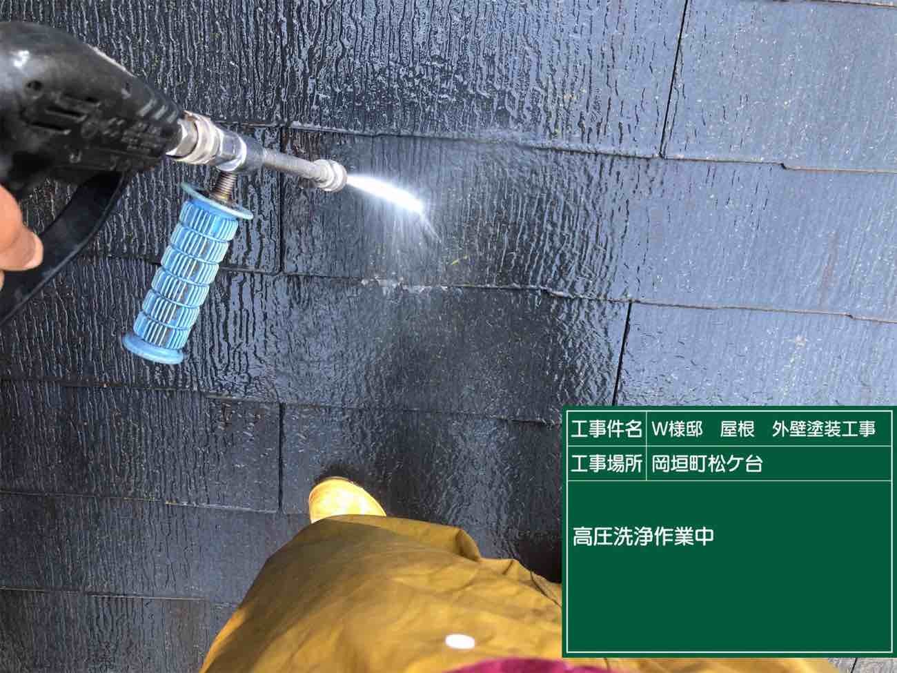 屋根の高圧洗浄作業を行います。屋根材に付着した汚れを落としていきます。