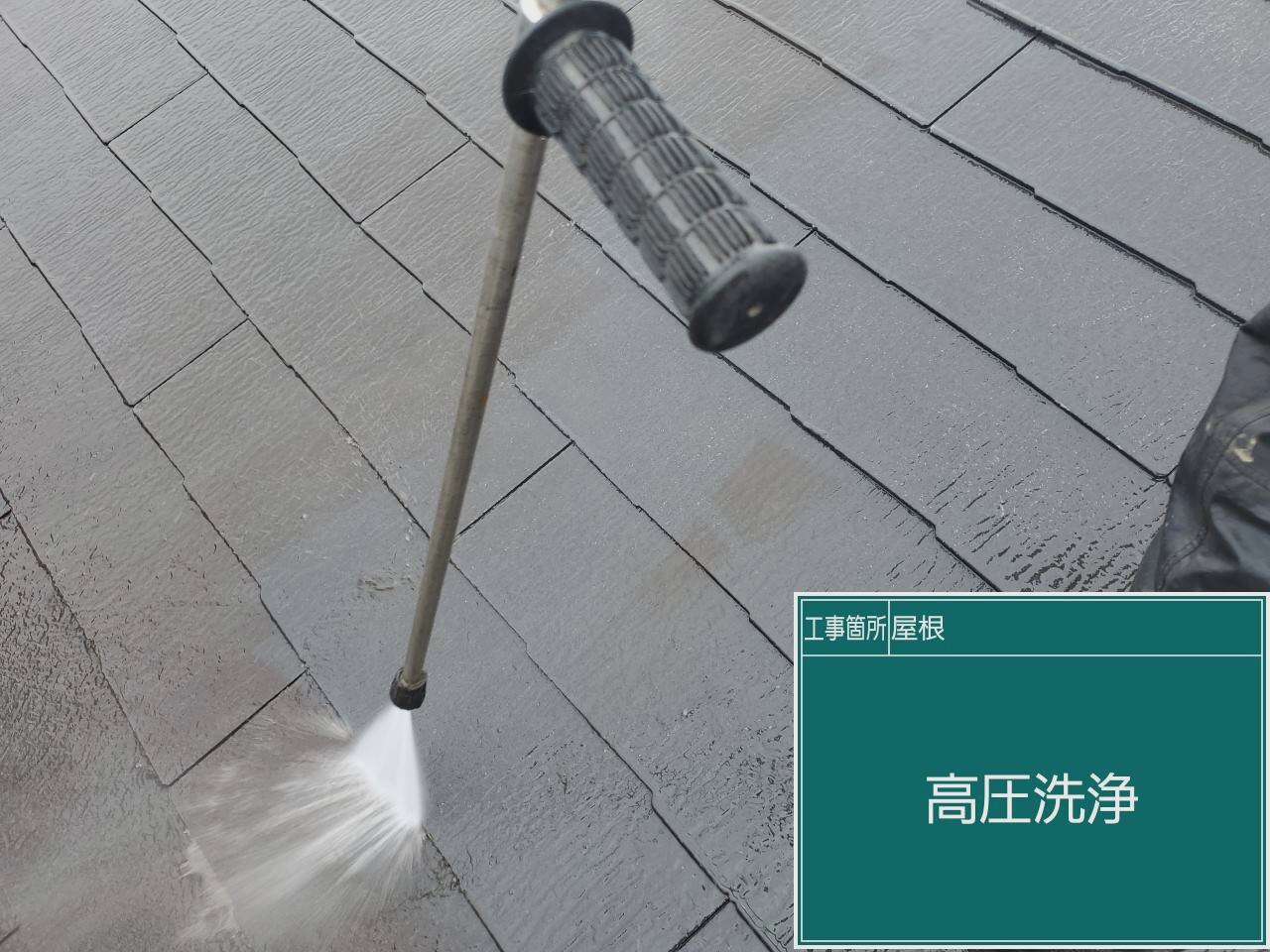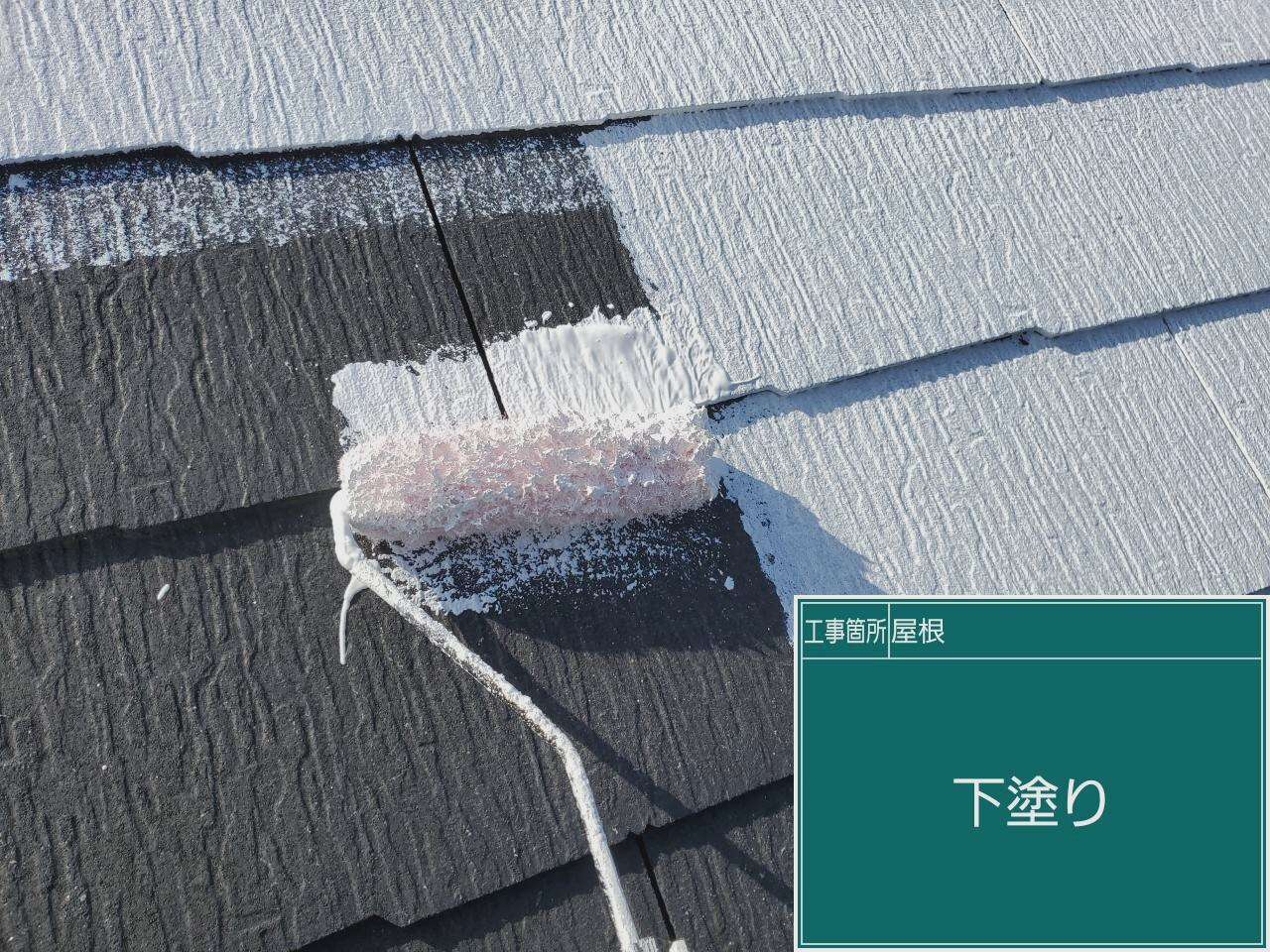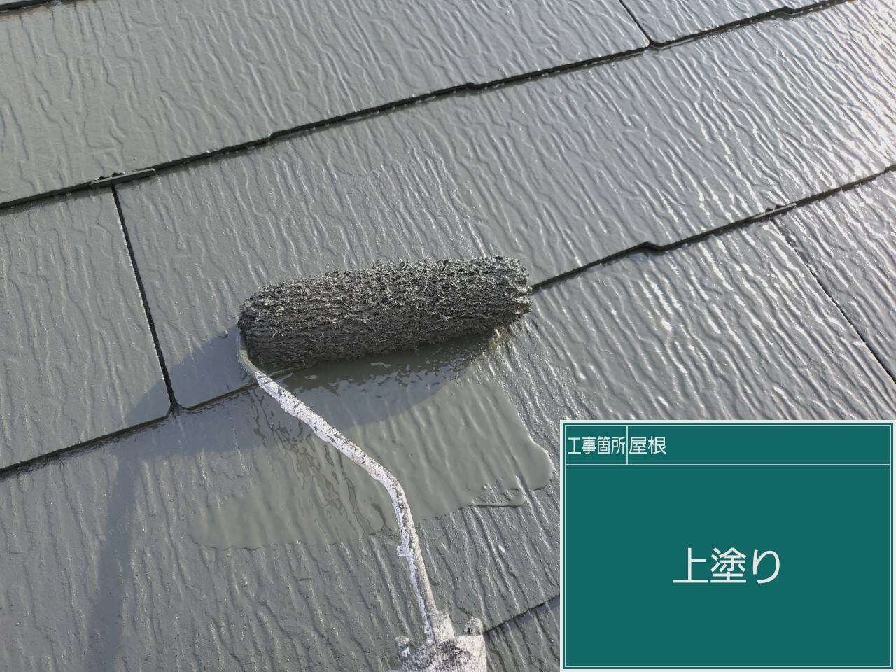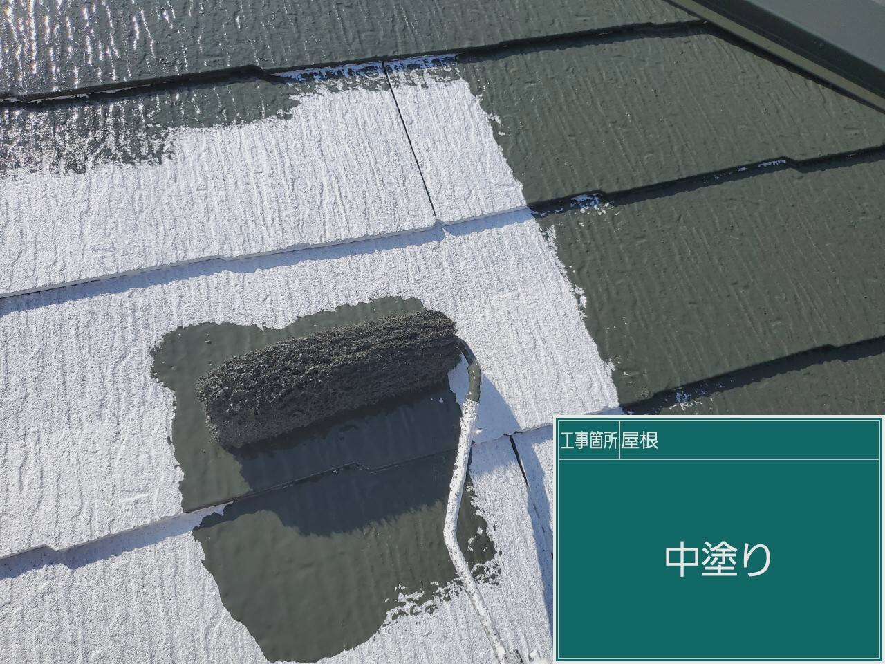 屋根の中塗りです。下塗りで密着性を高めた後は中塗りで厚みを出していきます。