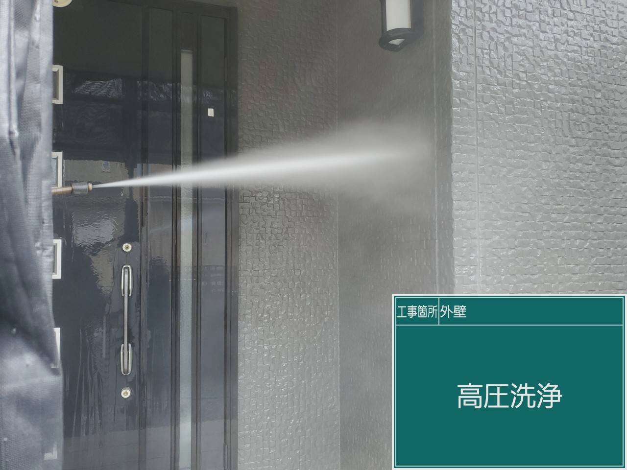 外壁も同じように高圧洗浄機にて洗浄作業を行います。外壁にも汚れは付着していますので確り落としていきます。