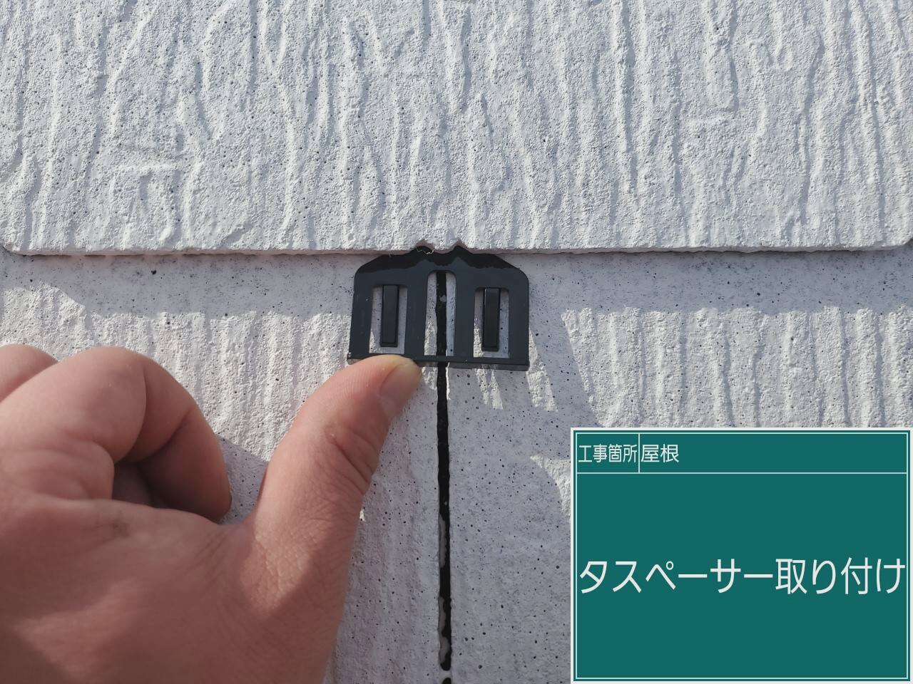 屋根材の間にタスペーサーという工具を取り付けていきます。タスペーサーを挟むことで通気ができ湿気がたまらないようにしていきます。