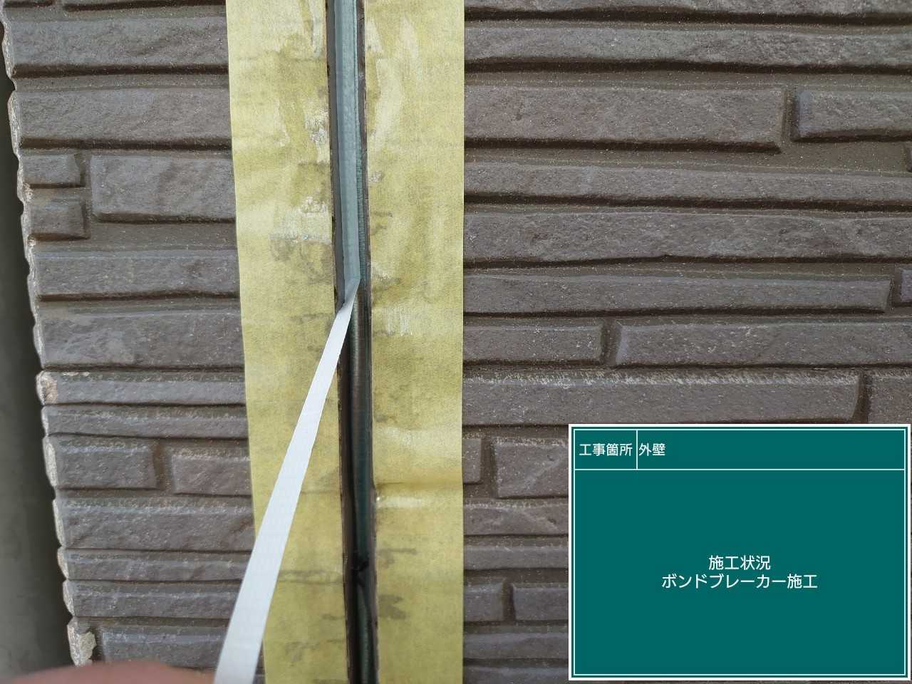 目地の底にボンドブレーカーを接着していきます。これでシーリングの3面接着を防ぎます。