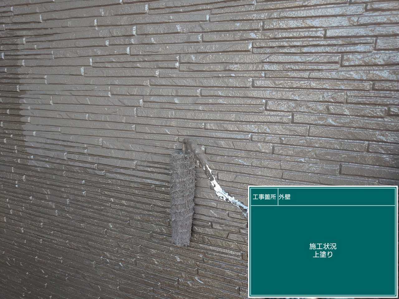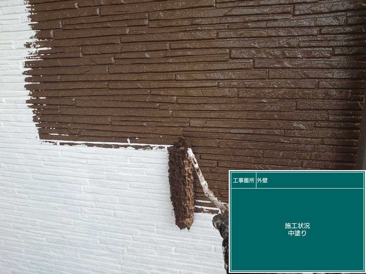 外壁の中塗り作業です。中塗りでは塗装の膜を厚くしていきます。