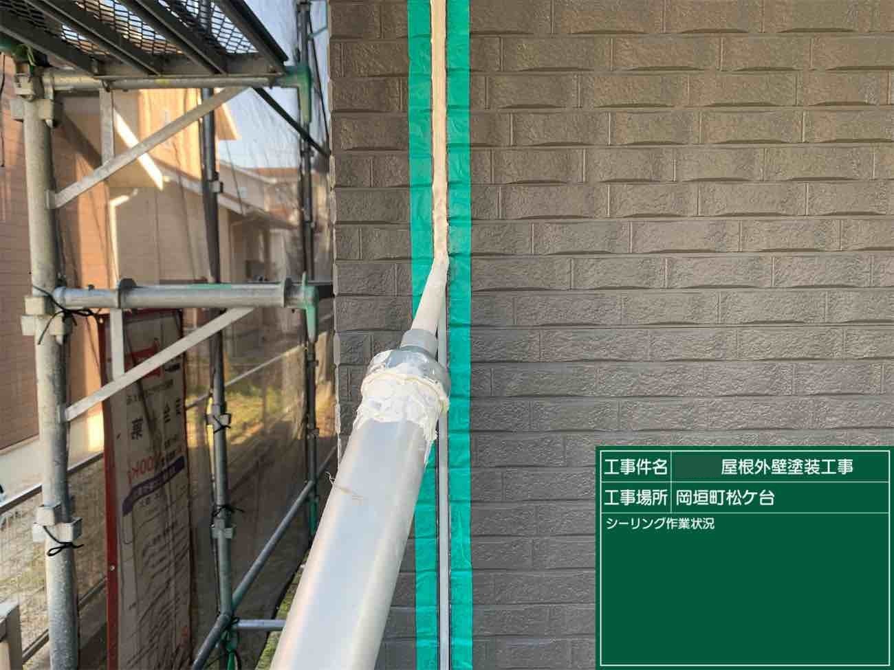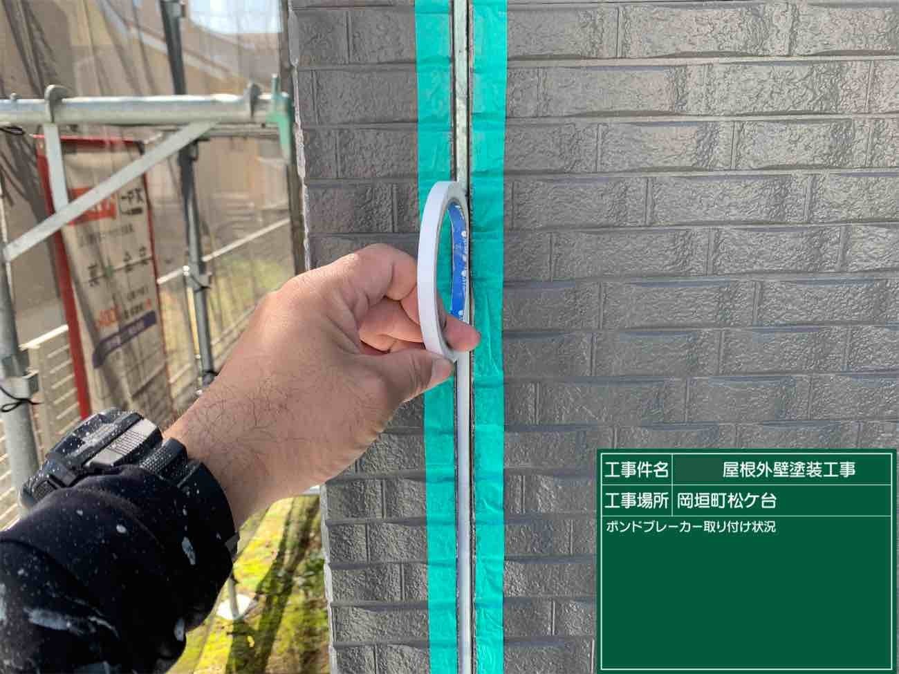 目地の底にボンドブレーカーを接着していきます。シーリングの3面接着を防ぎます。