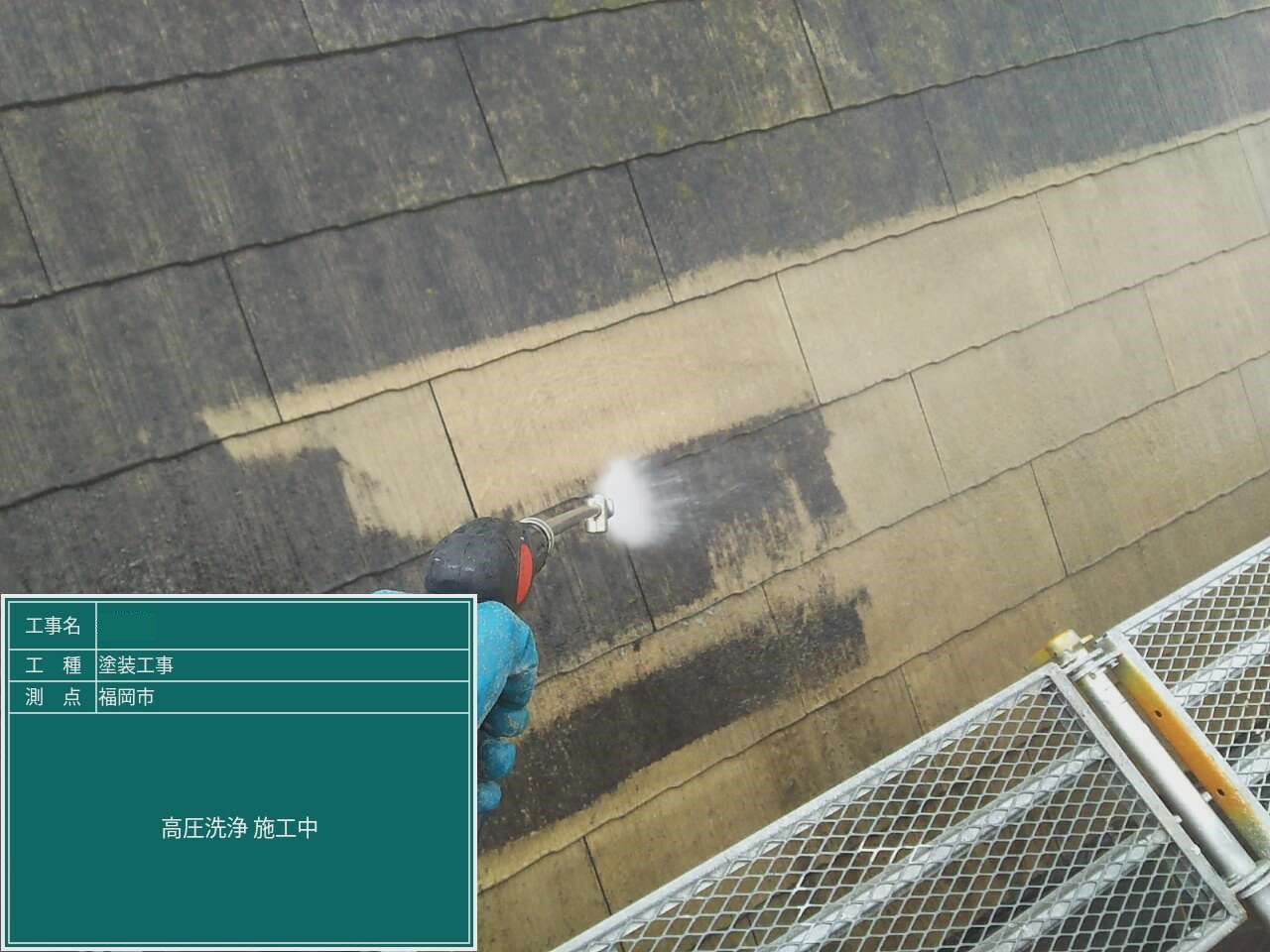 屋根は一番汚れがついています。 高圧洗浄機を用いて、汚れを洗い流していきます。