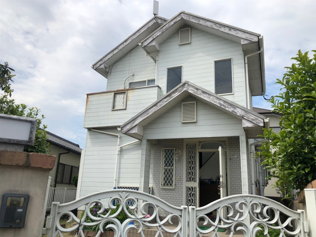 築40年の建物で、外壁の経年劣化に加え、雨樋の劣化や錆も見受けられたため、今回は塗装工事とあわせて雨樋交換・エアコン工事を同時に行いました。 近隣との距離が近...