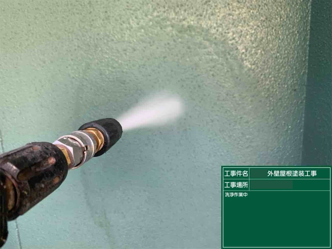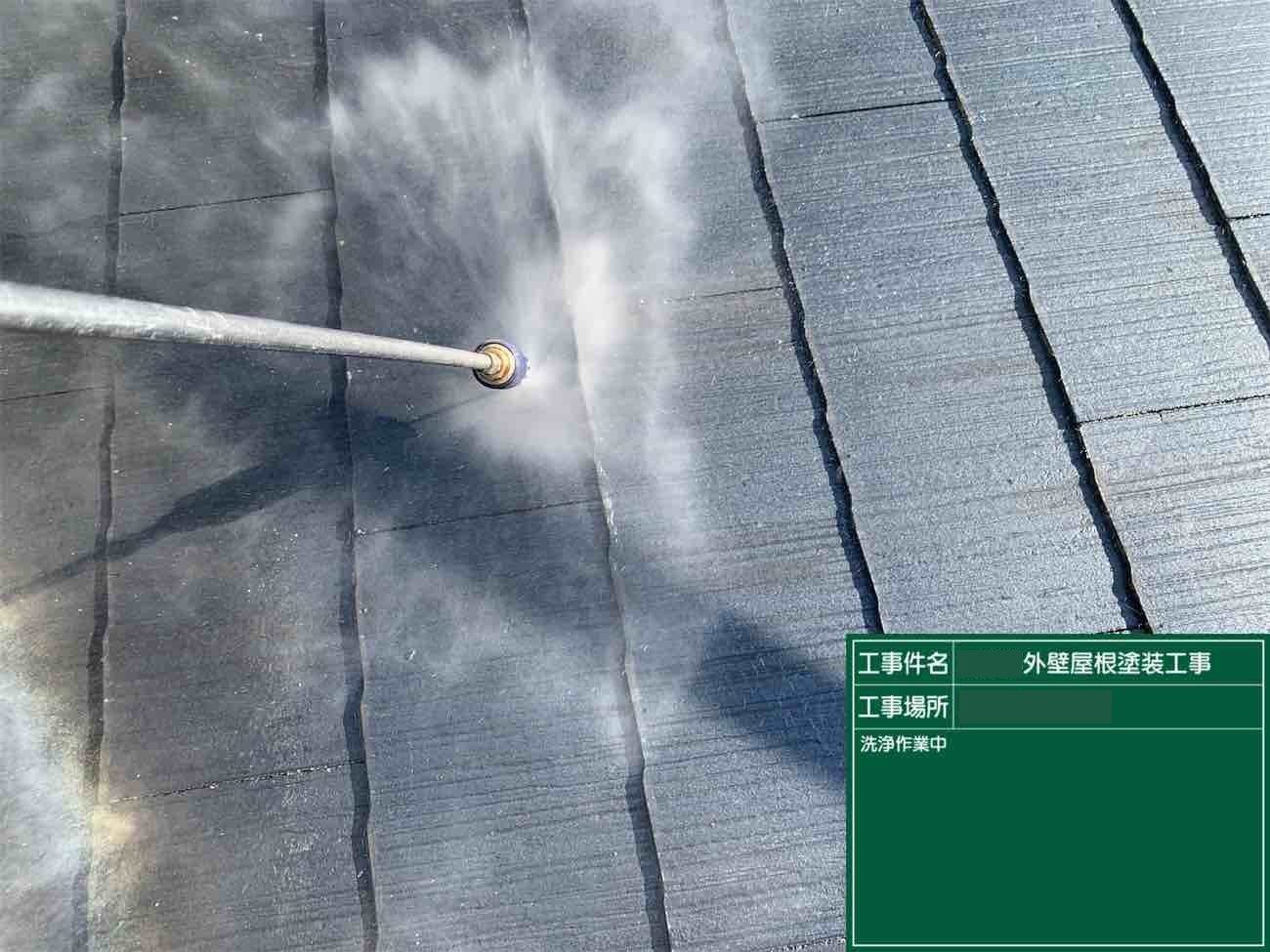 屋根の洗浄作業の様子です。屋根と外壁の洗浄を行い、きれいにしていきます。