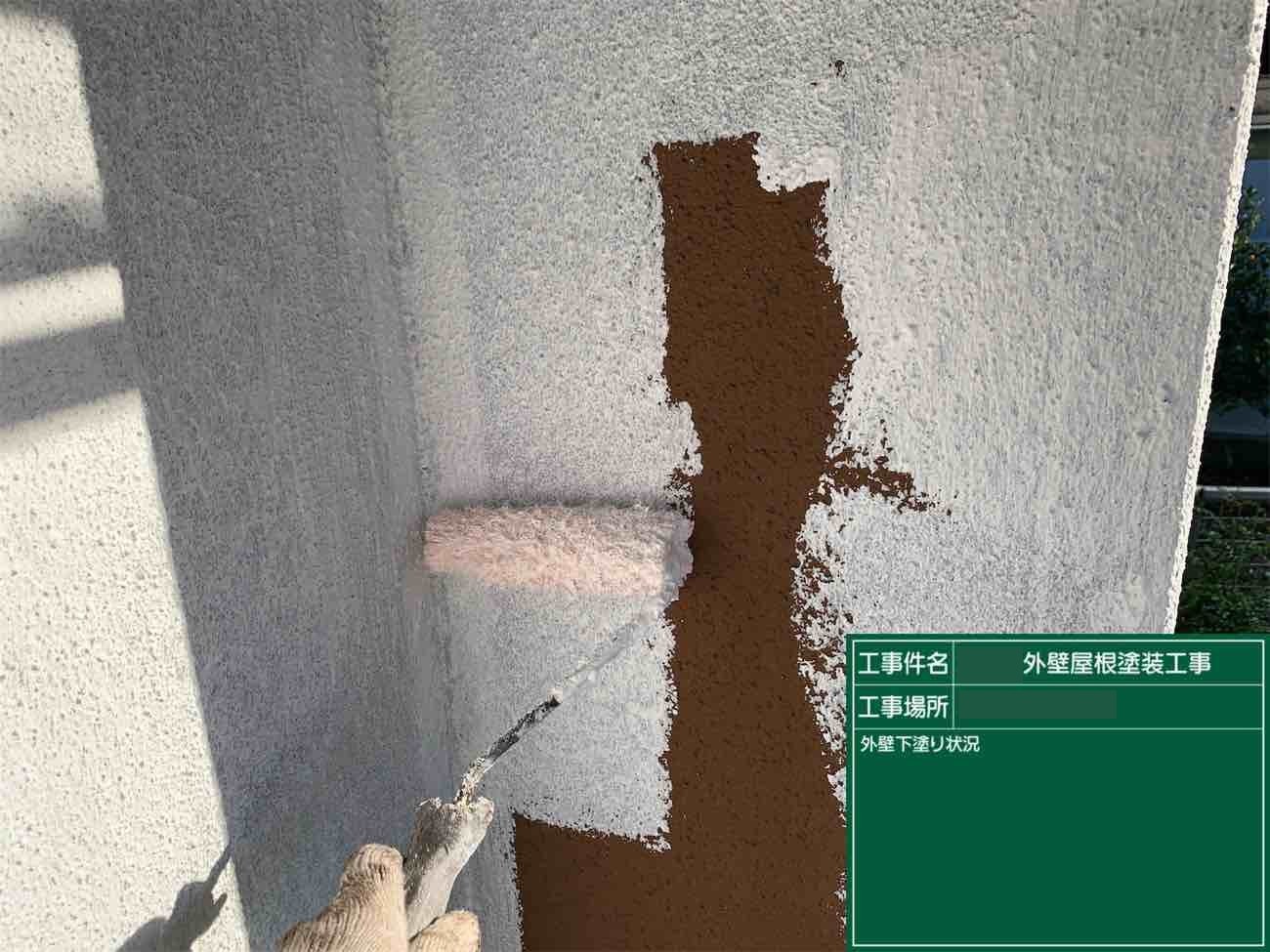 外壁の下地を守るためにも塗装を行いますが、まずは下塗りで下地と塗料の密着性を高めます。