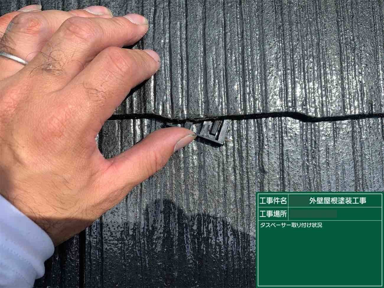 次にタスペーサーという縁切りの機能をもった工具を使用します。屋根材との間に差し込む形で使用し通気性をよくし塗膜が出来ないようにします。