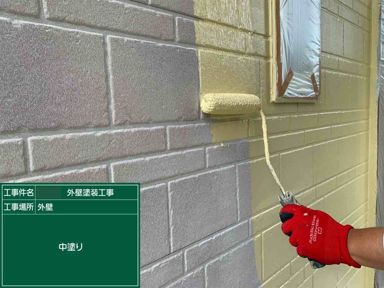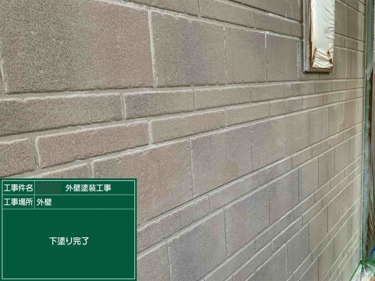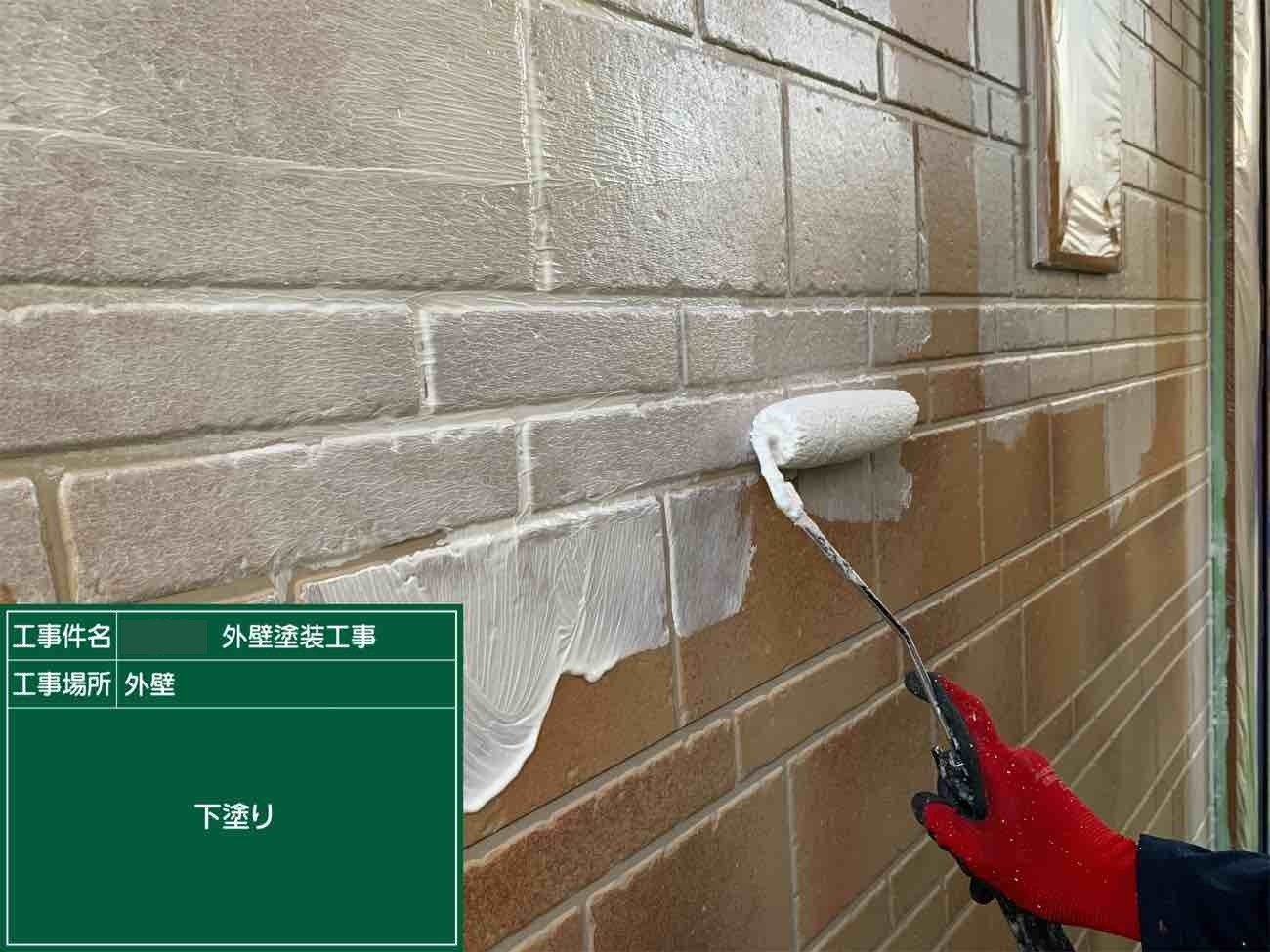 外壁の下塗り作業を行います。下塗りでは下地と塗料の密着性を高めていきます。