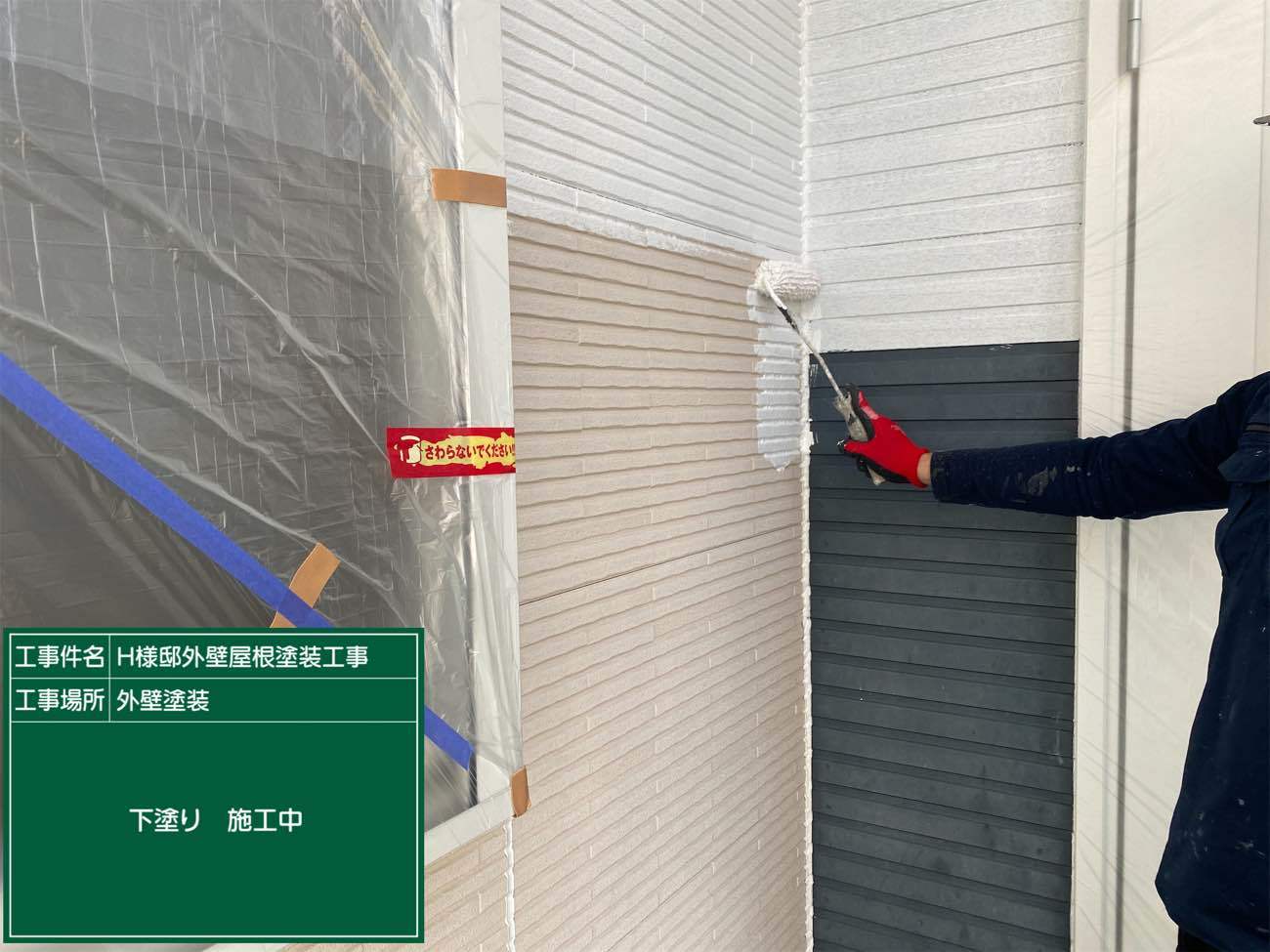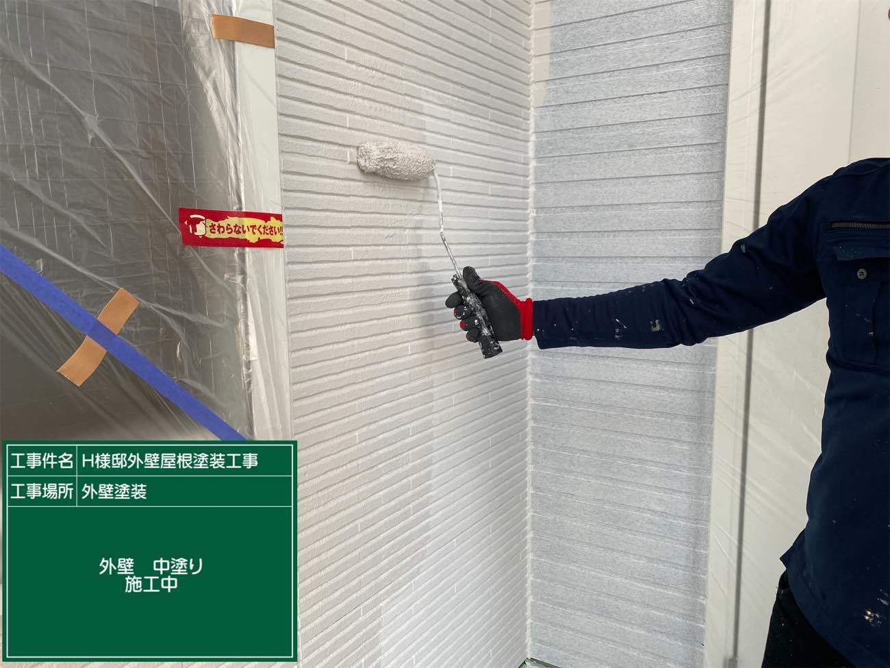 中塗りを施工していきます。下塗りの時と同様にまず凹凸の深い部分を塗って全体をローラーで塗っていきます。
