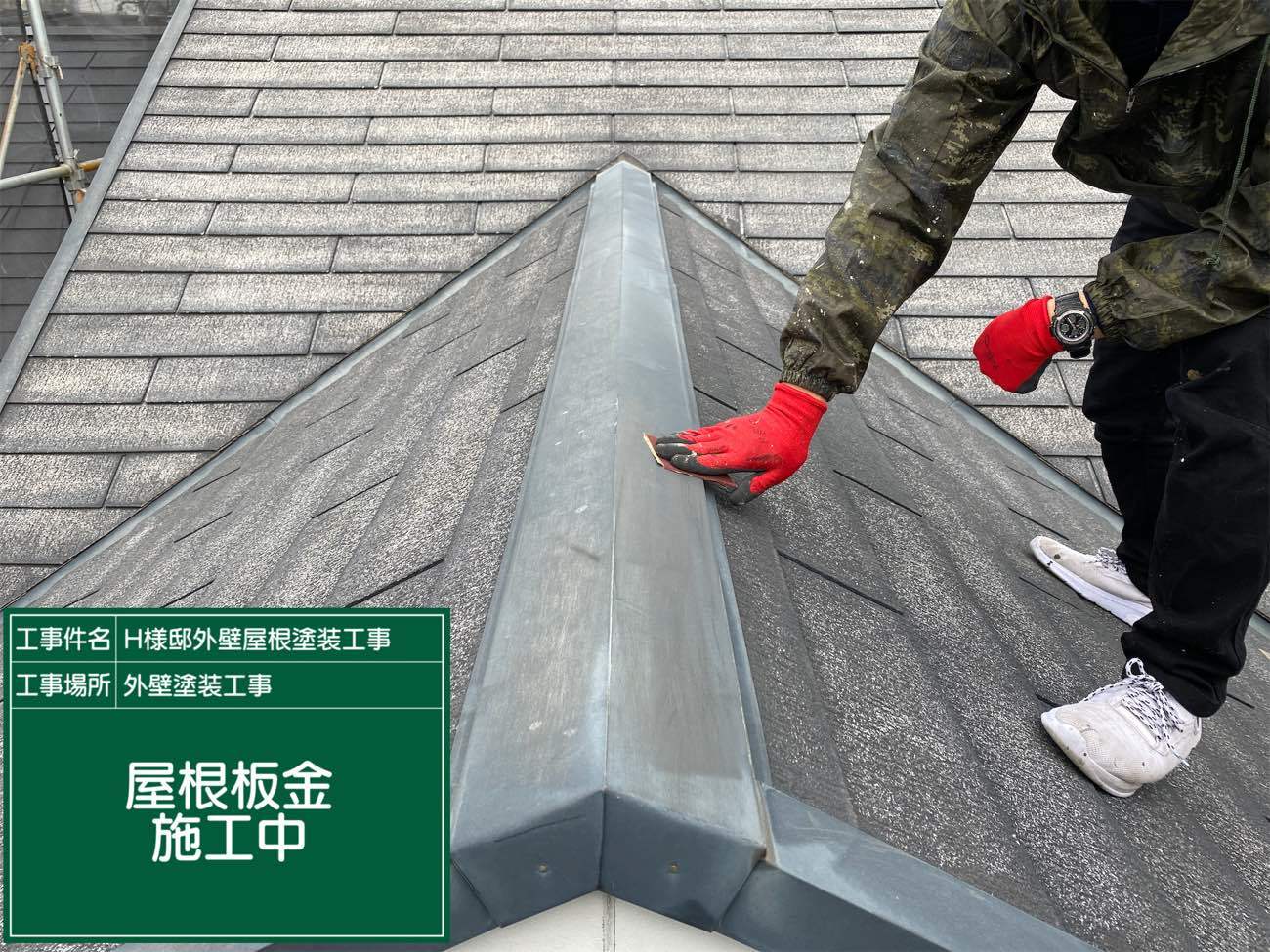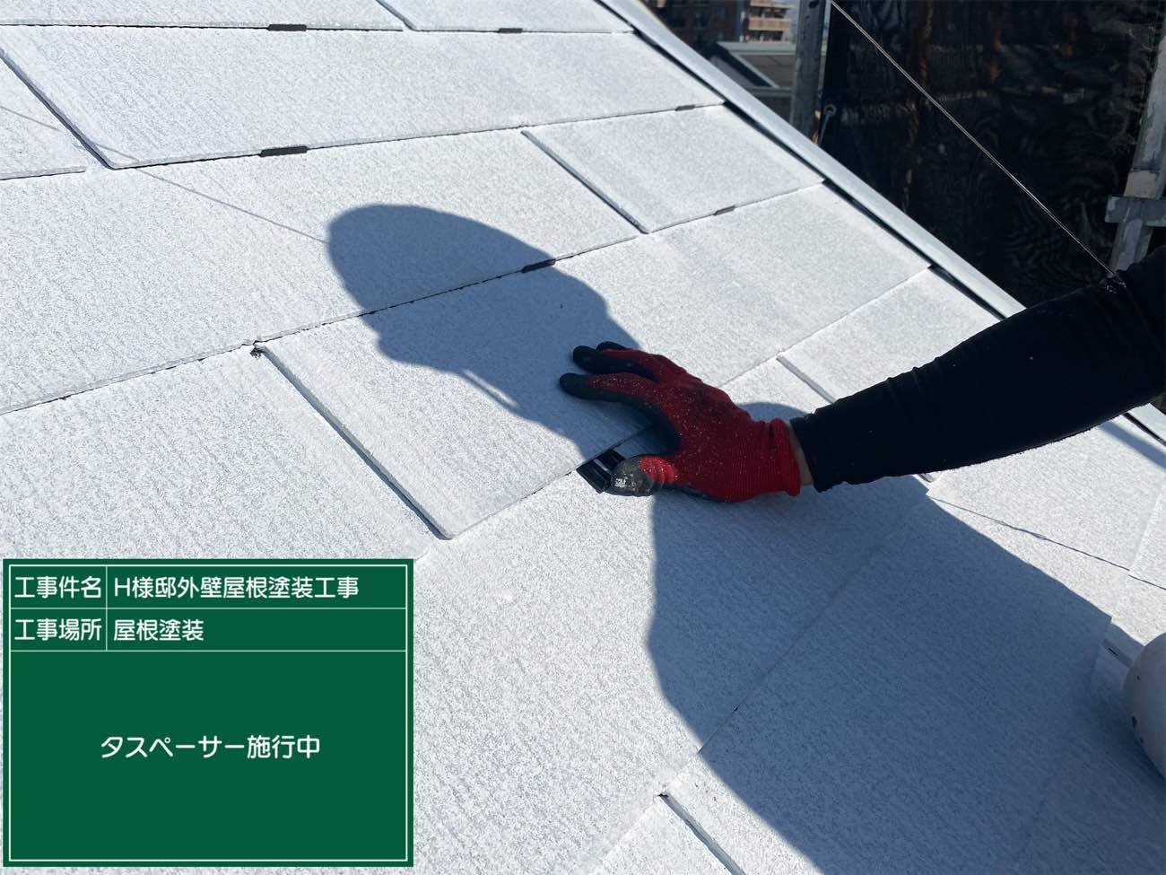 タスペーサー挿入。等間隔で挿入し塗装によって雨漏れを悠春する可能性を下げます。