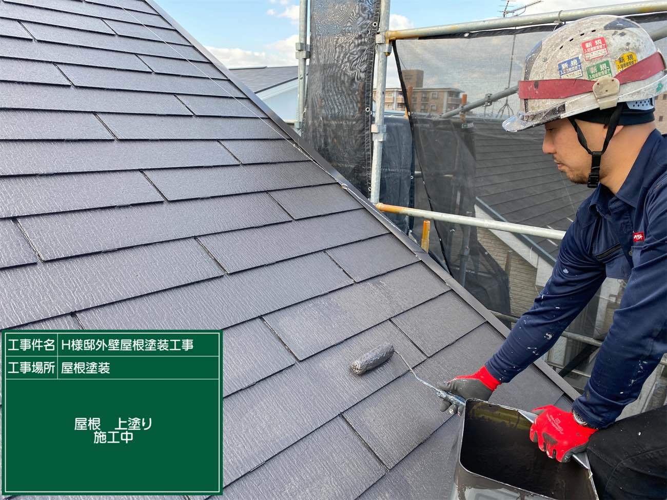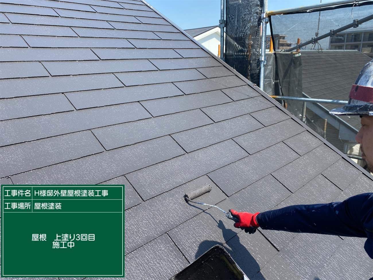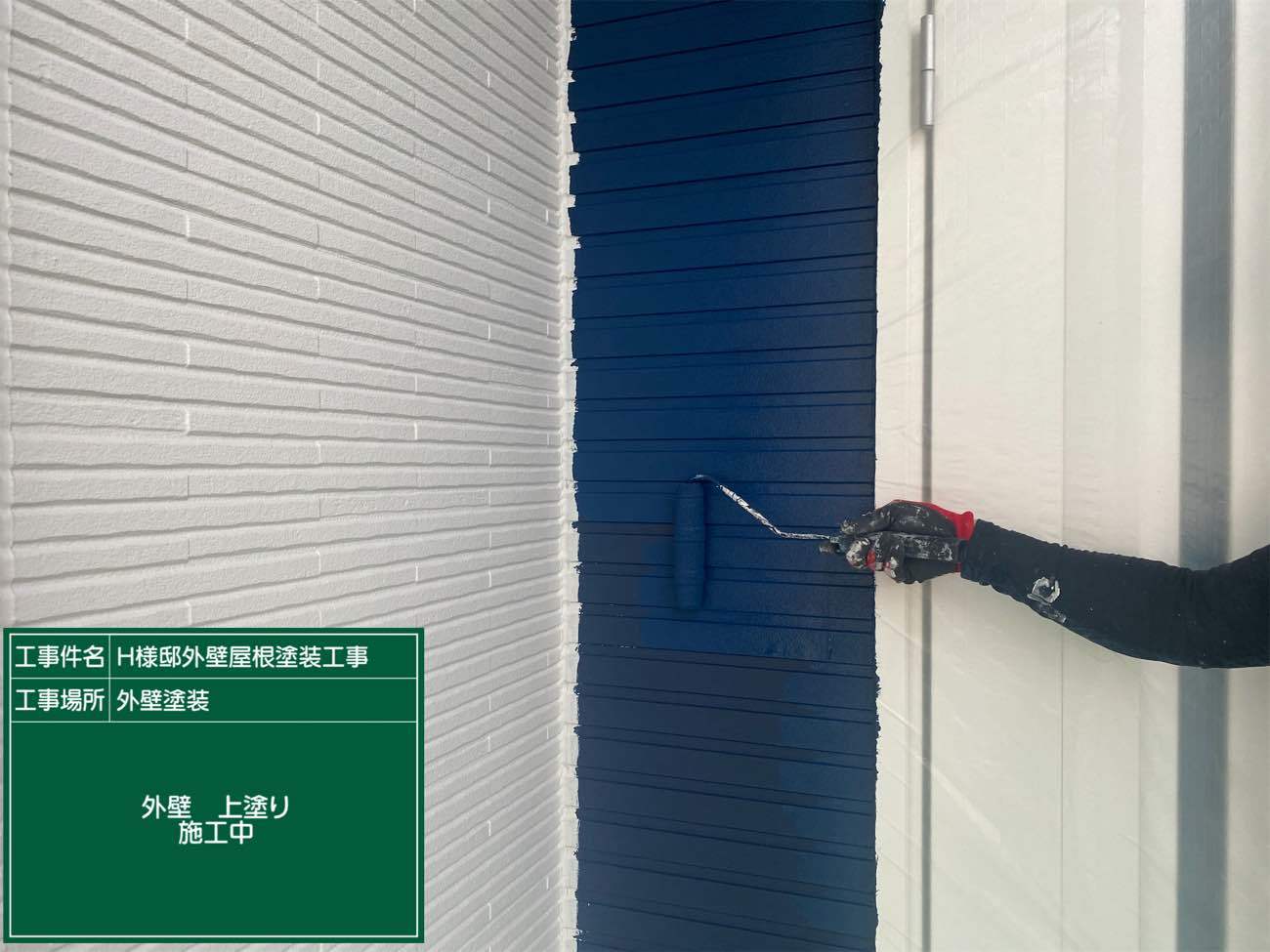 上塗り施工中…。色コントラストが美しいです。見栄えにもこだわって最後は刷毛なども使用し整えていきます。