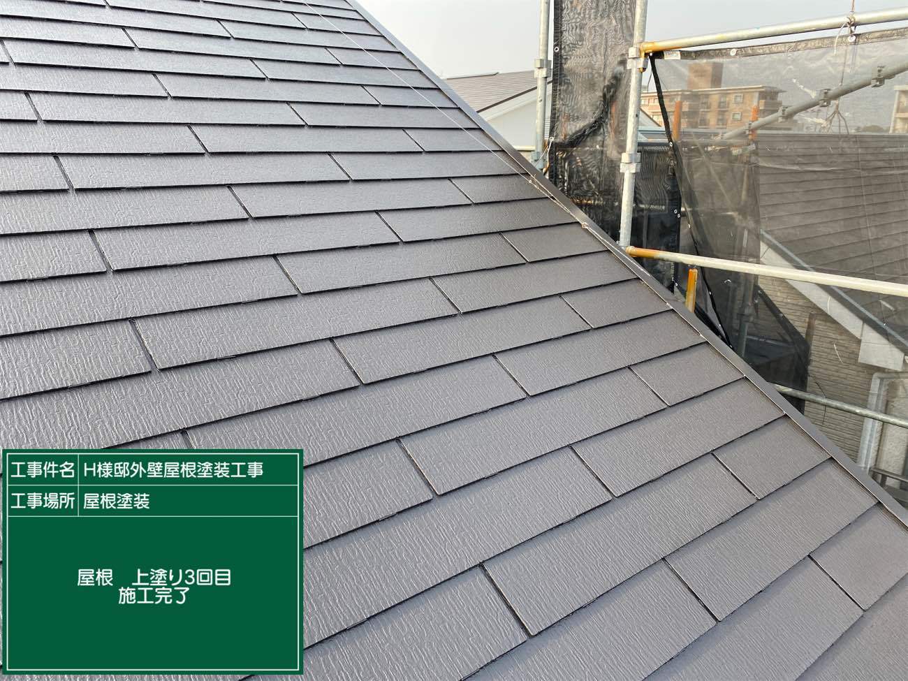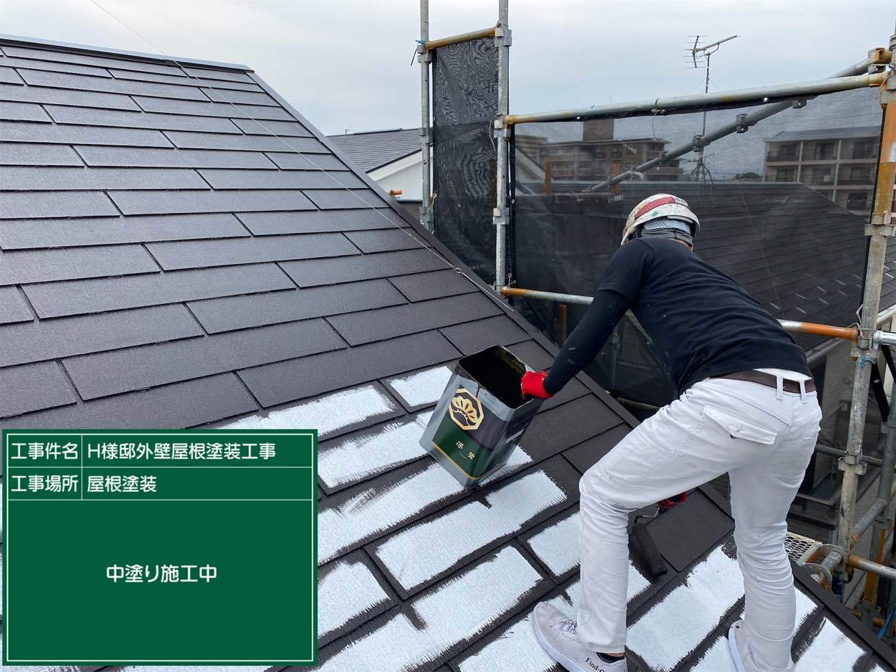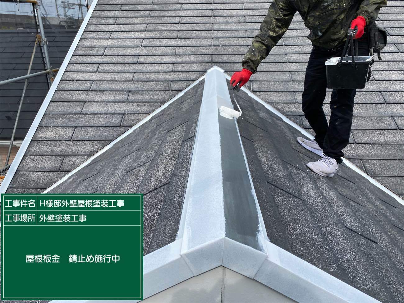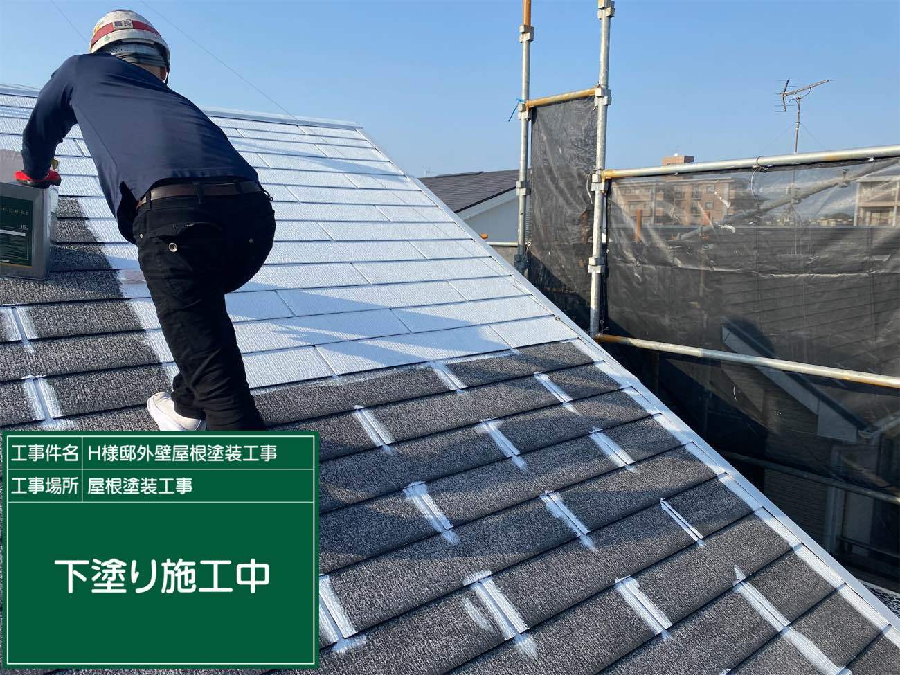 下塗りです。縦にちょんちょんと塗られているのは瓦の狭いスキマの部分。凹凸が深くローラーではうまく塗料がのらないので先に刷毛などでこのように塗ってしまうのです。