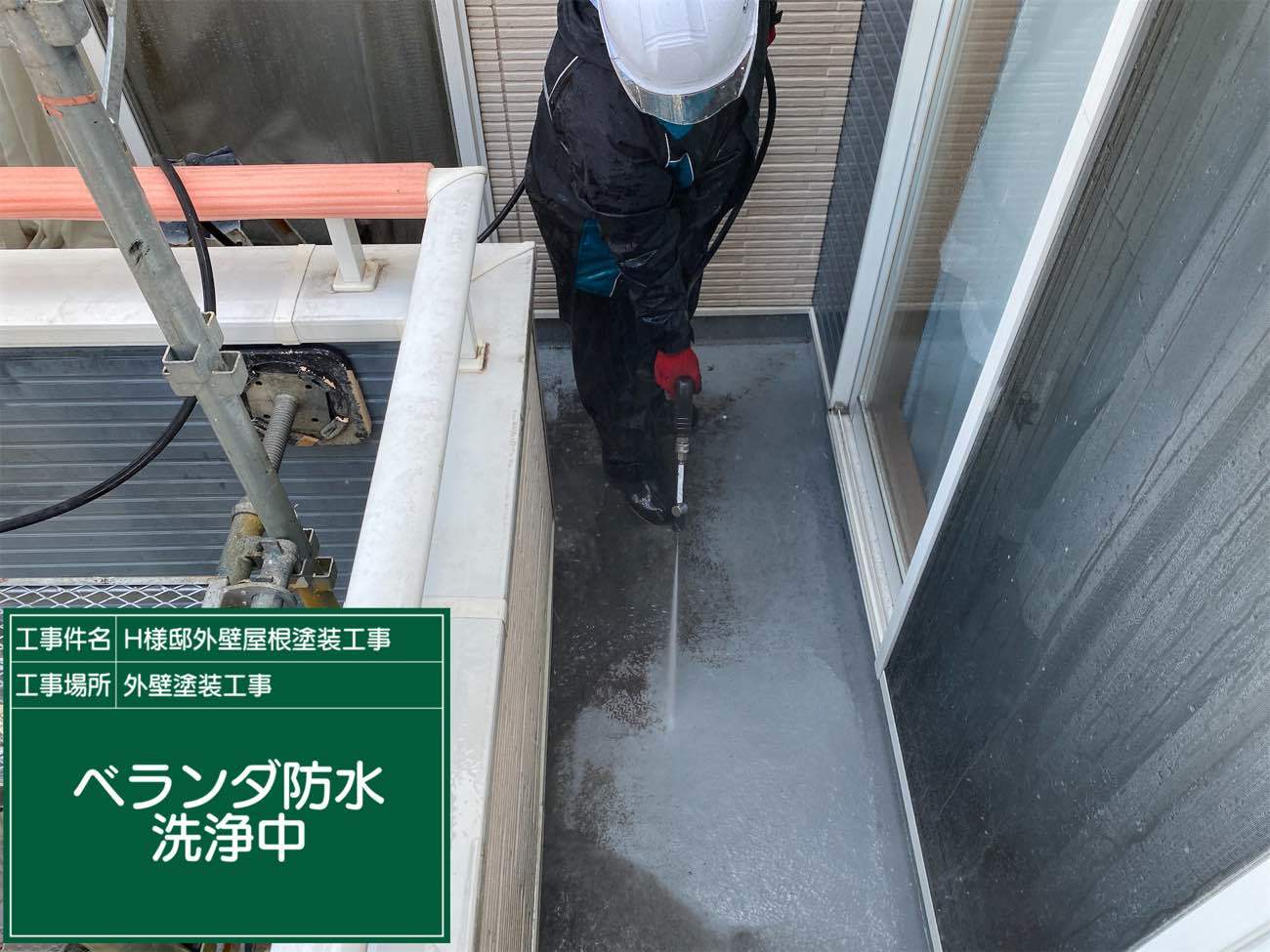 ベランダ部分もぬかりなく洗浄していきます。コケや汚れ、チョーキングによって発生した粉など出来る限り洗い流していきます。
