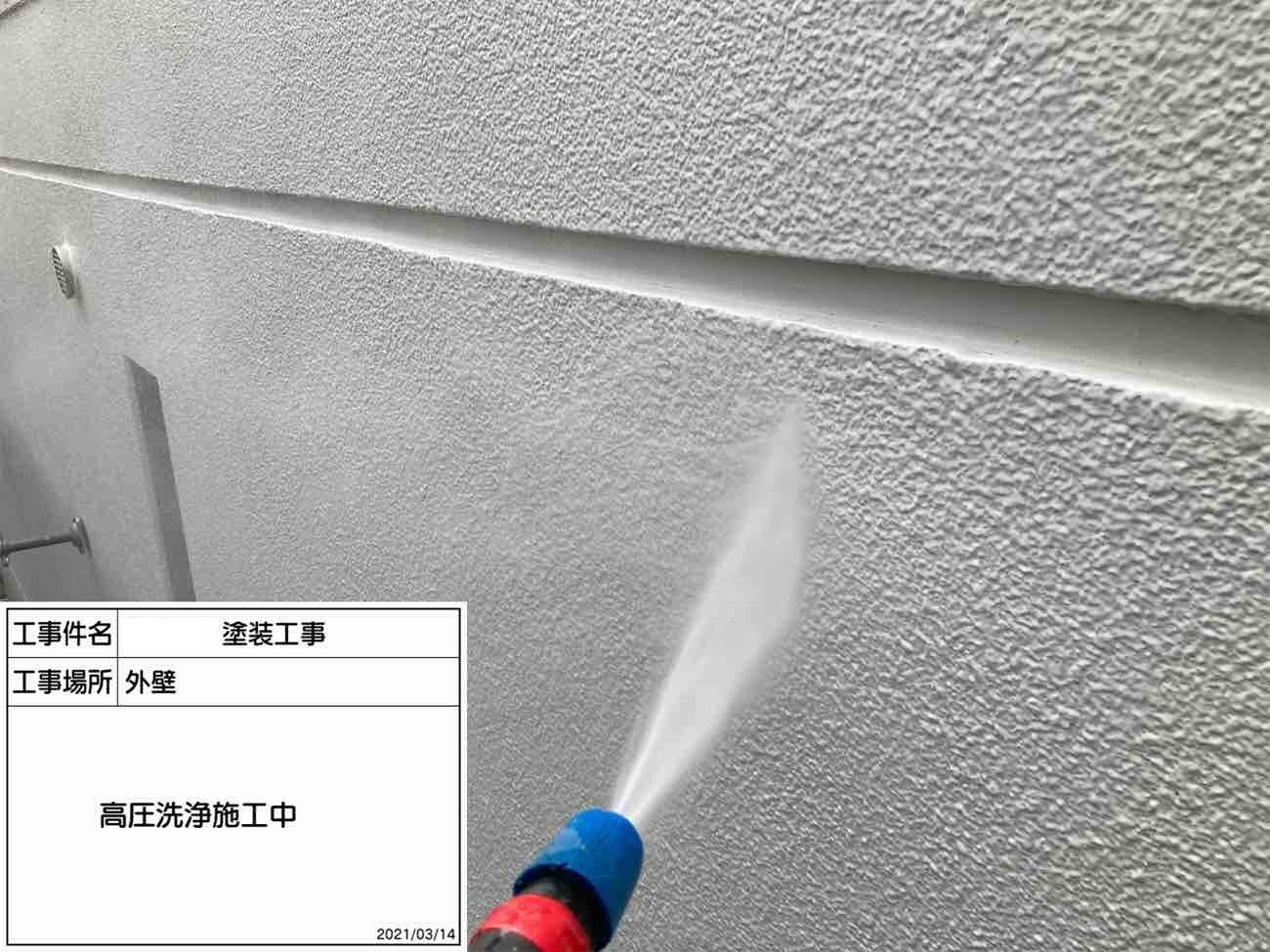 外壁の洗浄作業を行います。洗浄作業できれいにして、乾燥させてから塗装作業に入ります。