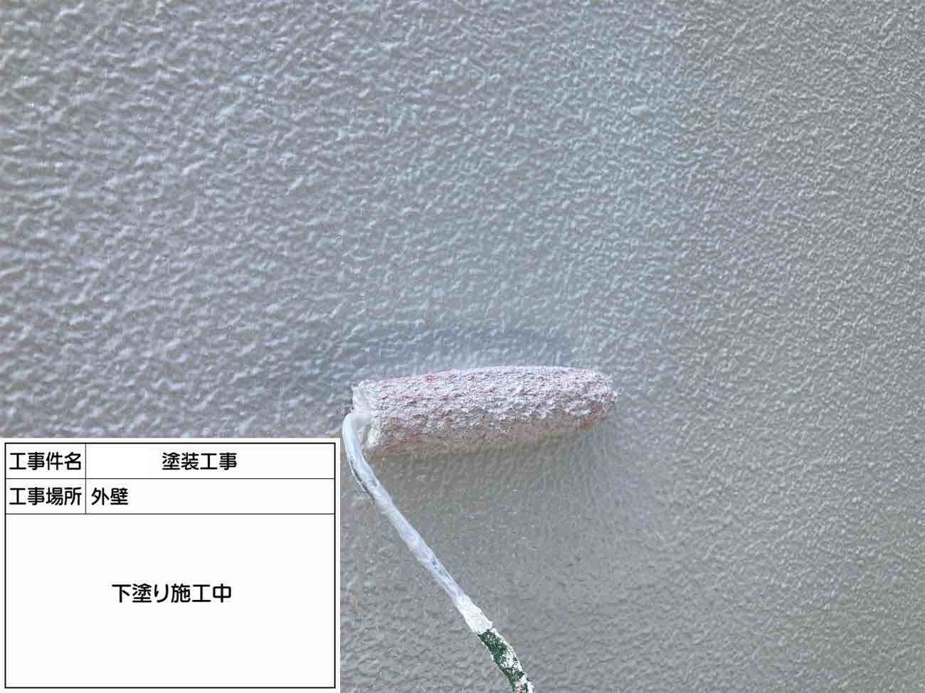 外壁の下塗り作業では下地と塗料の密着性を高めるために塗装を行っていきます。