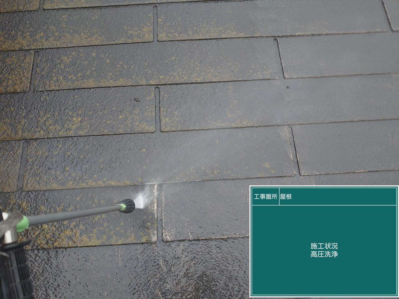 屋根の洗浄作業です。屋根に付着している汚れを洗浄で流していきます。