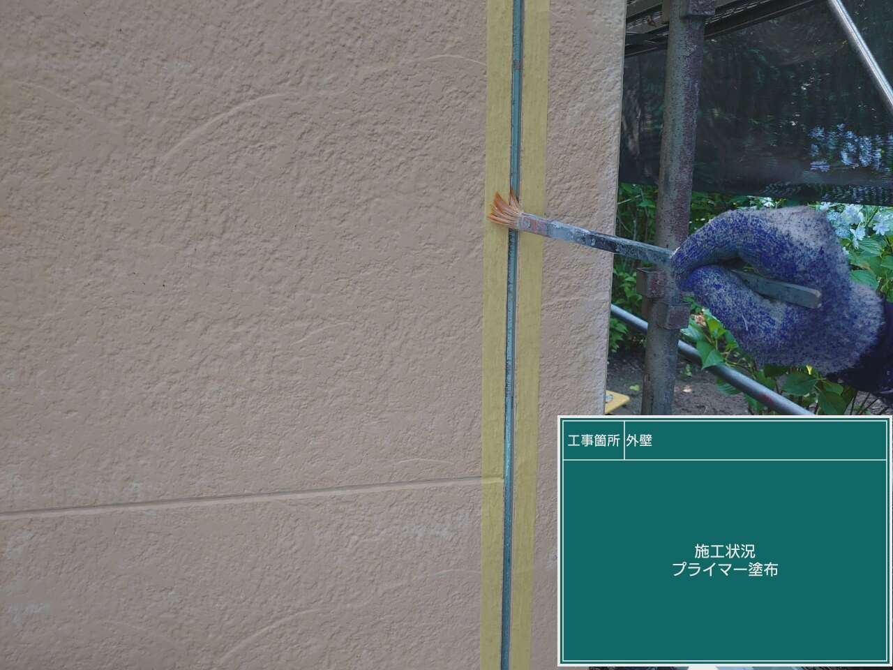 目地のシーリング打ち替え作業です。既存のシーリングを撤去し終えたら、目地の側面にプライマーを塗布します。