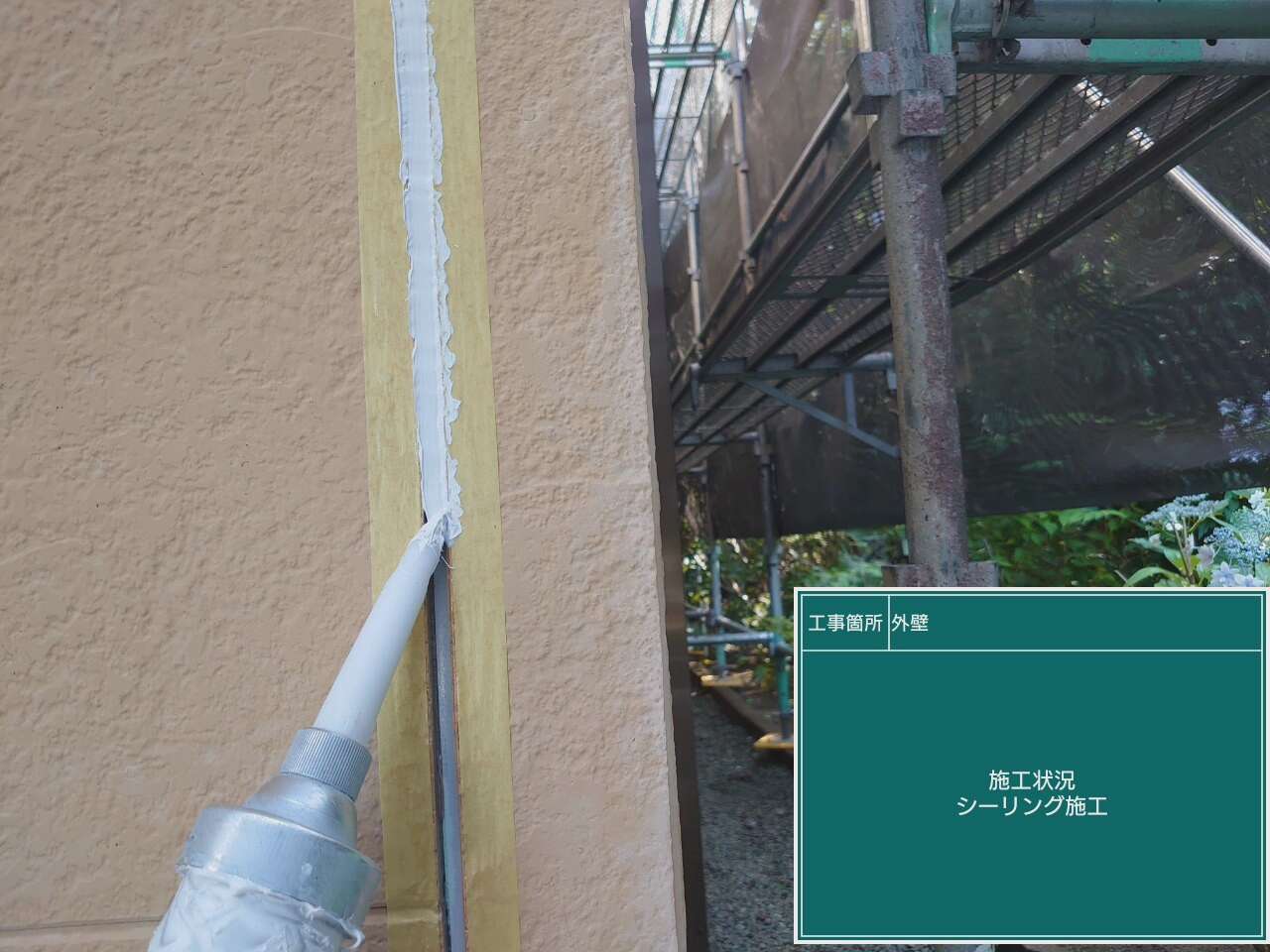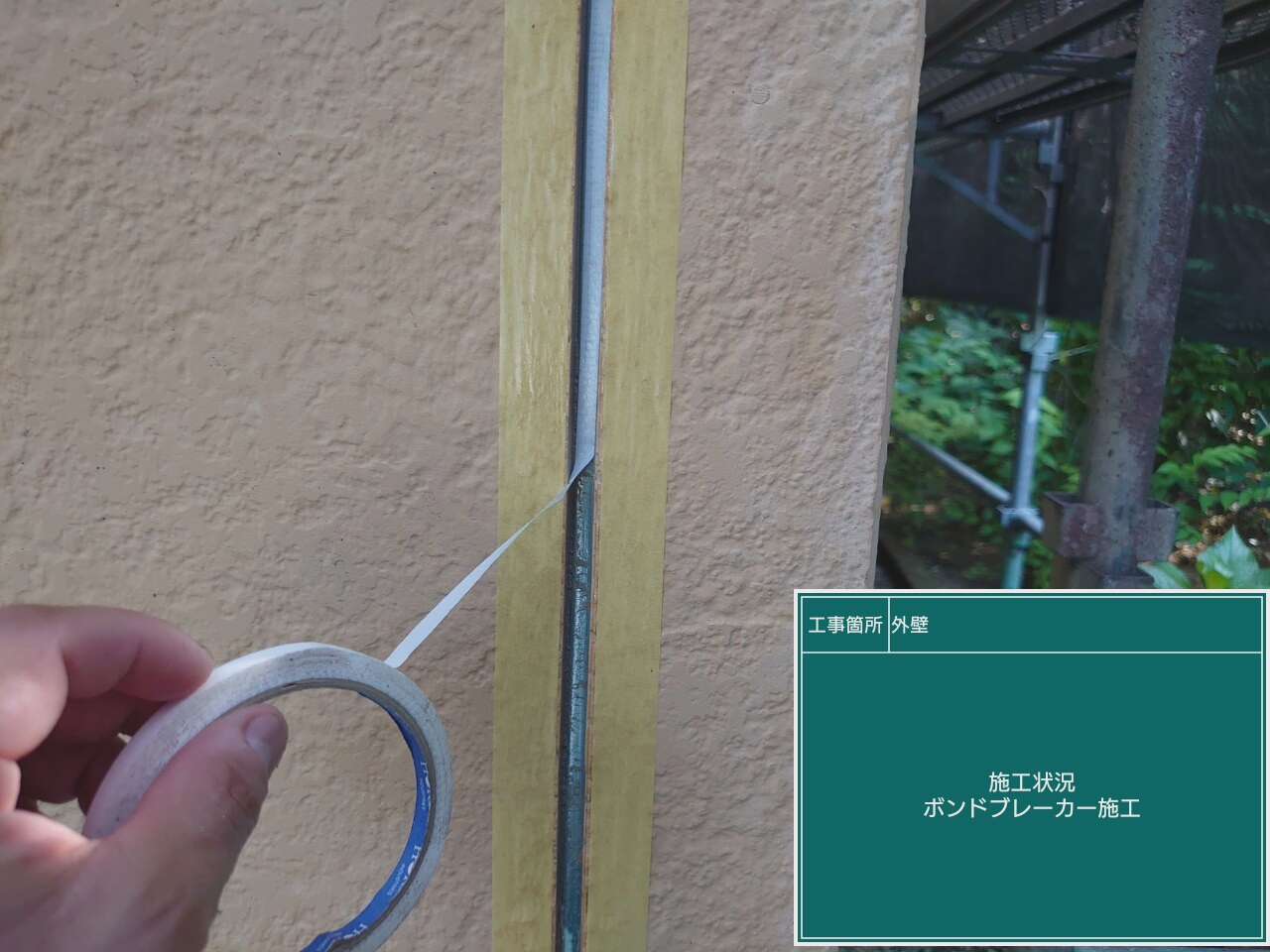 プライマーを塗布したら、目地の底にボンドブレーカーというテープを貼り目地のシーリングが3面接着するのを防ぎます。