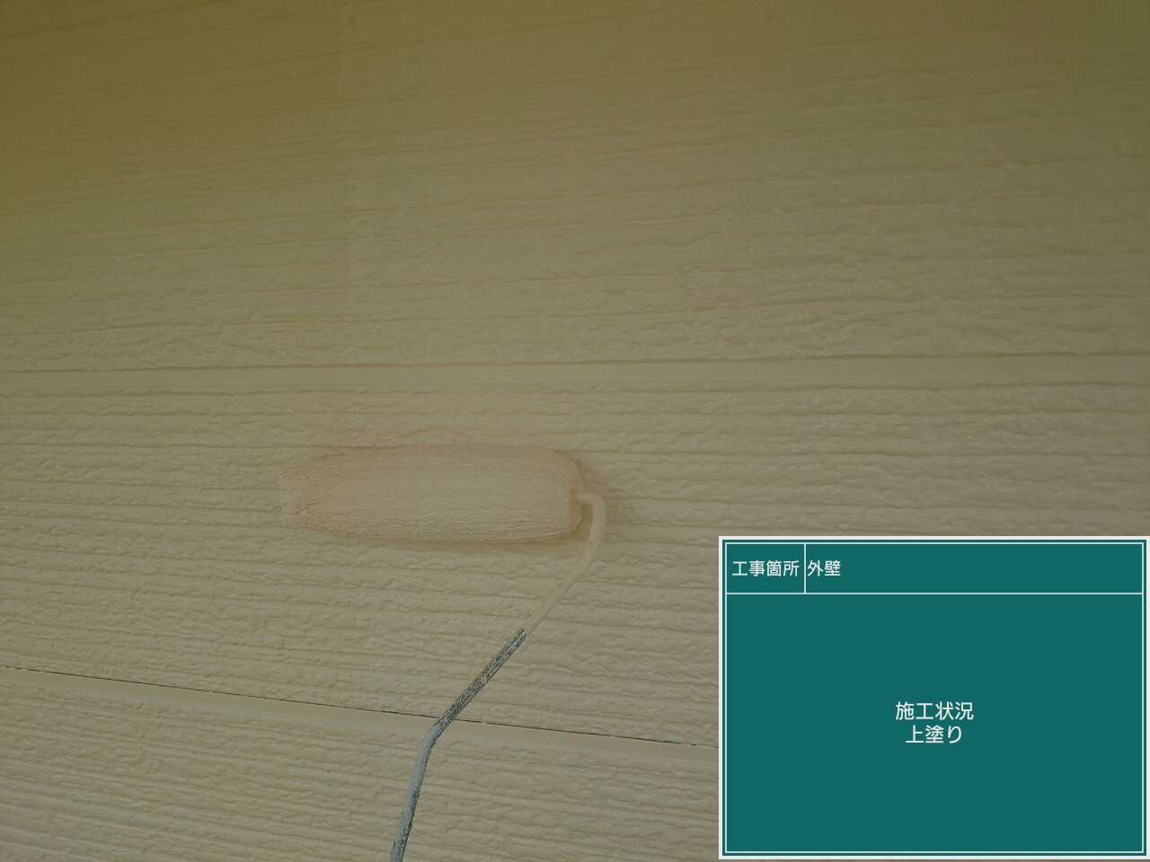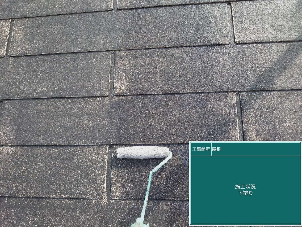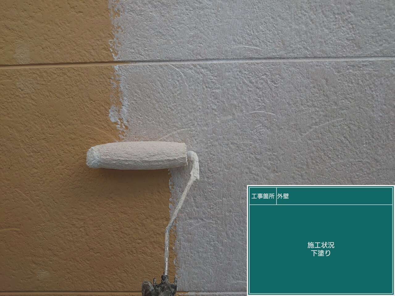 塗装作業を見ていきましょう。これは外壁の下塗り作業です。下塗り作業では外壁材の下地と塗料が密着しやすくなるようにする工程になります。