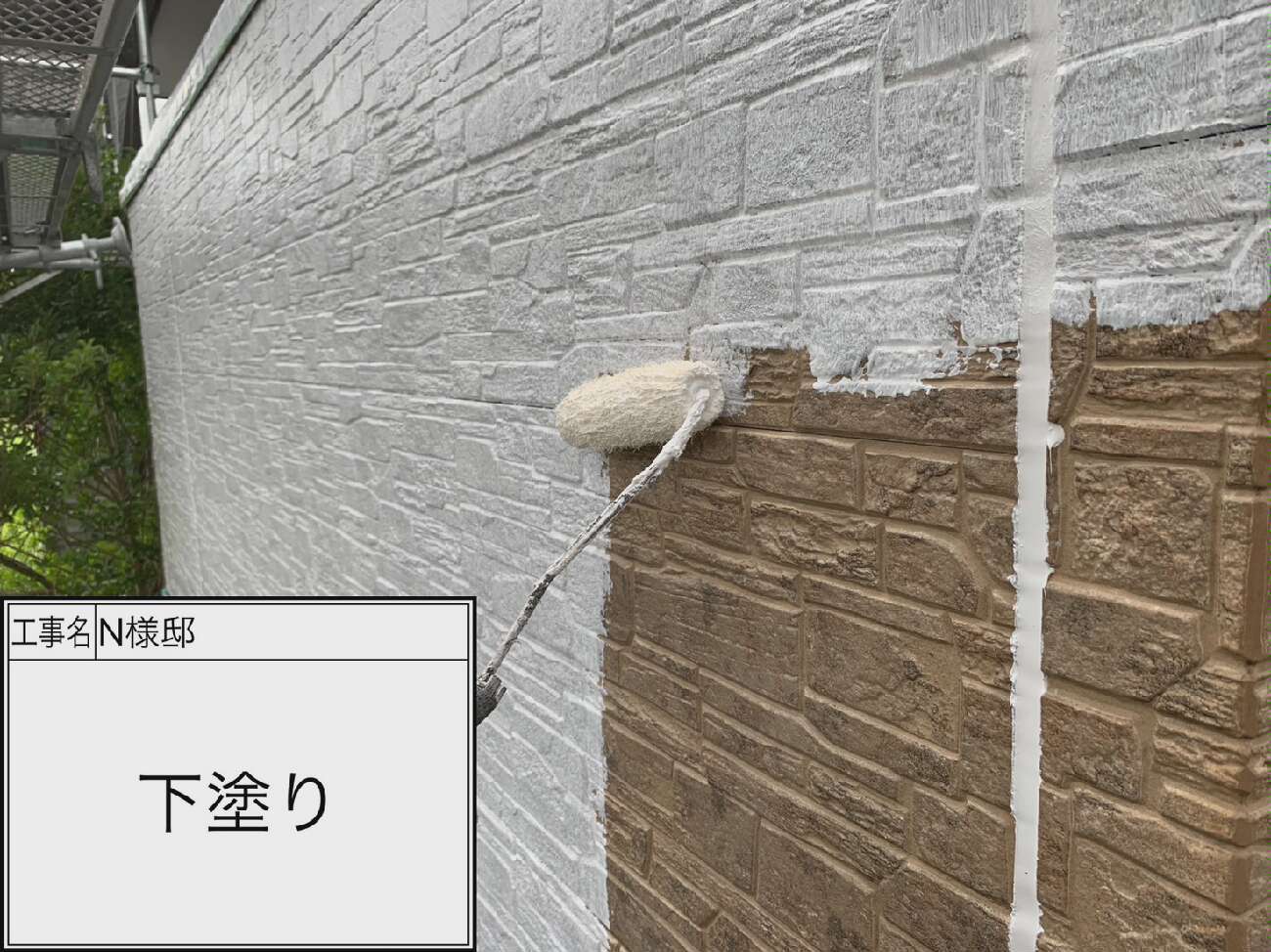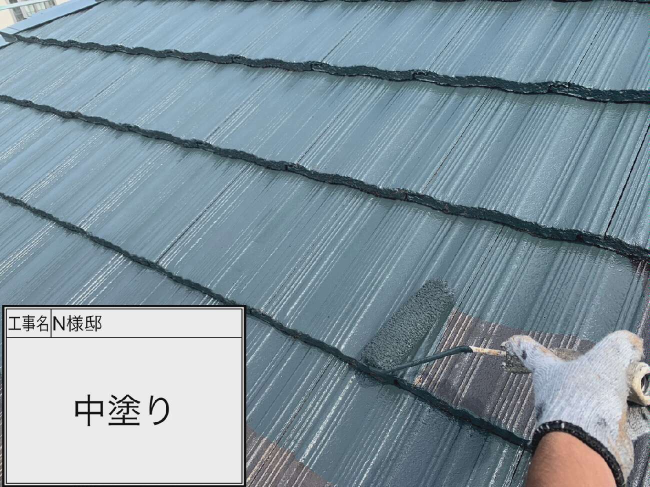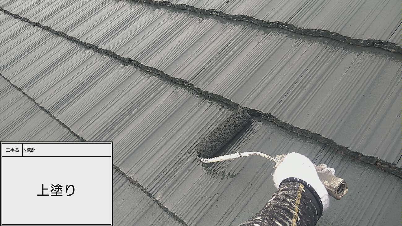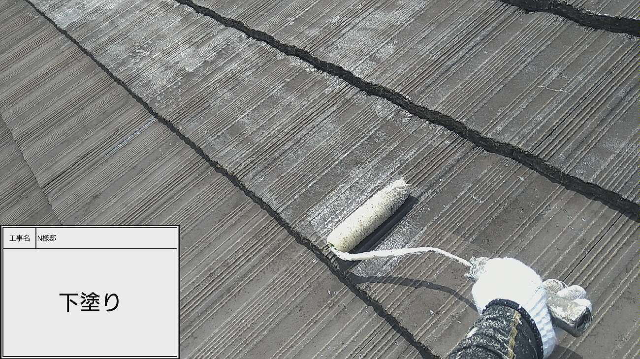 まずは専用下塗り材を塗布していきます。今回N様邸のお屋根の基材になっているモニエル瓦は塗料を吸い込みやすい基材の為、劣化状況にによっては下塗りを数度重ねたり、塗料の吸い込みを押さえる工程を入れることもあります。
