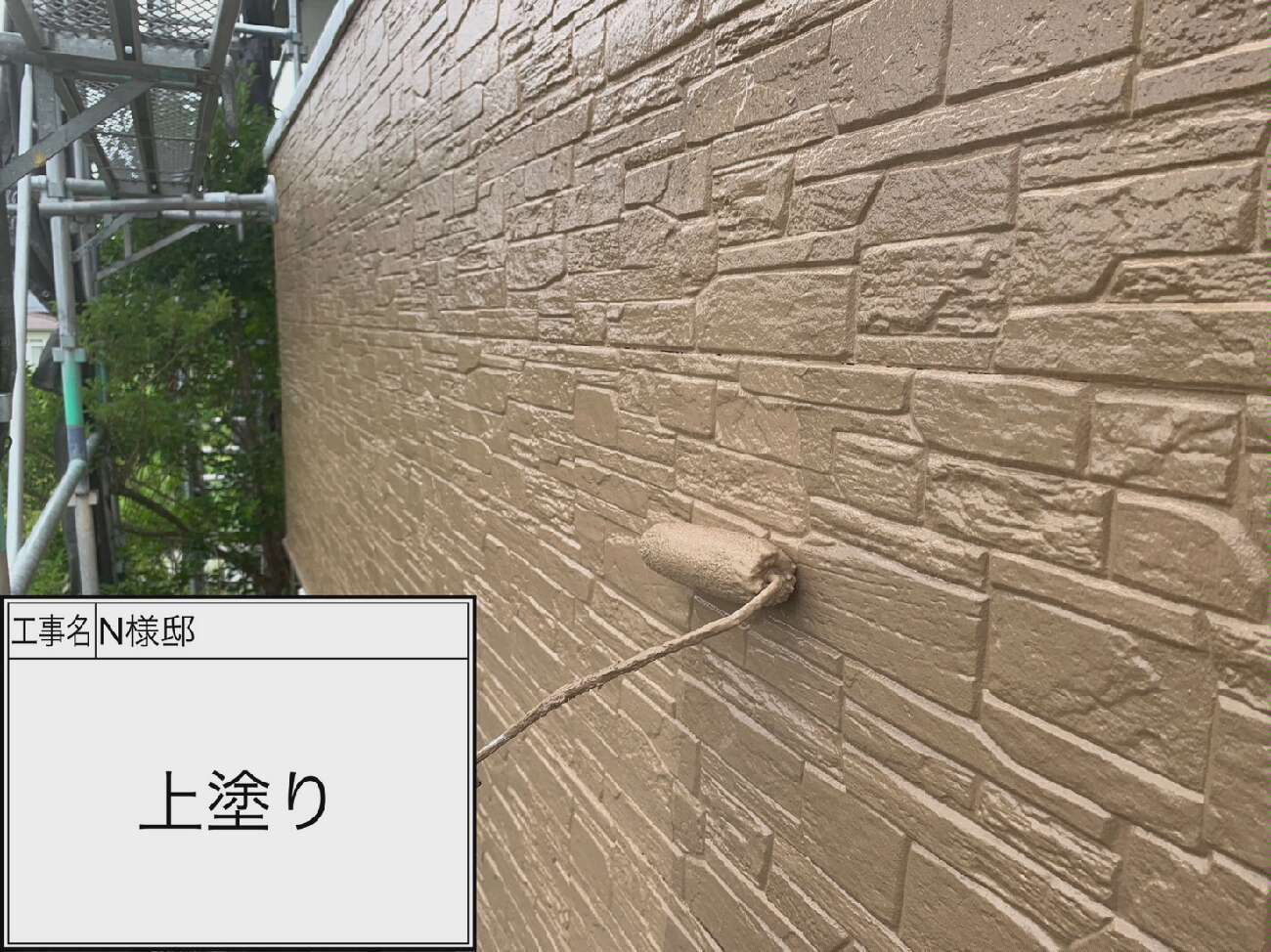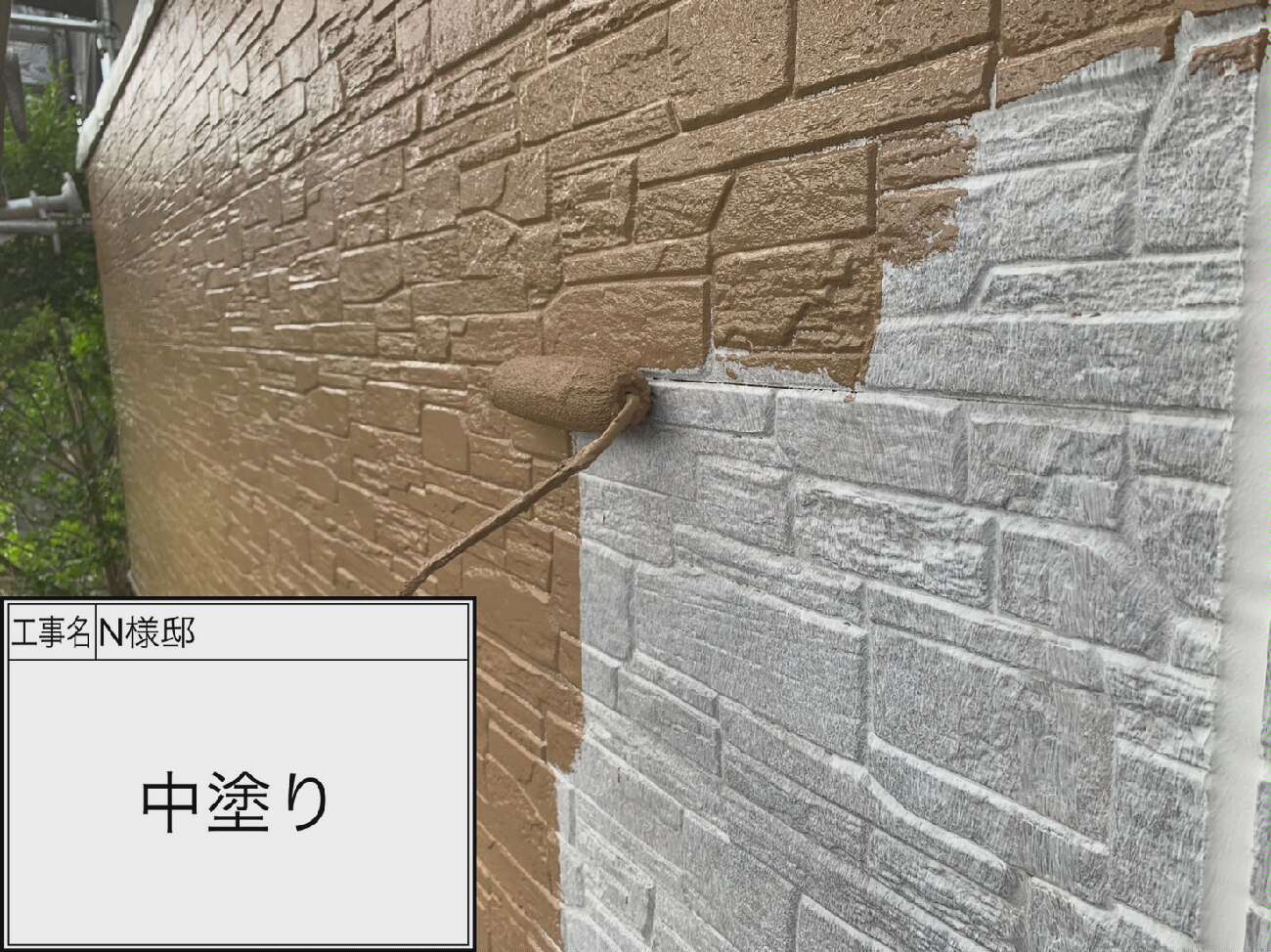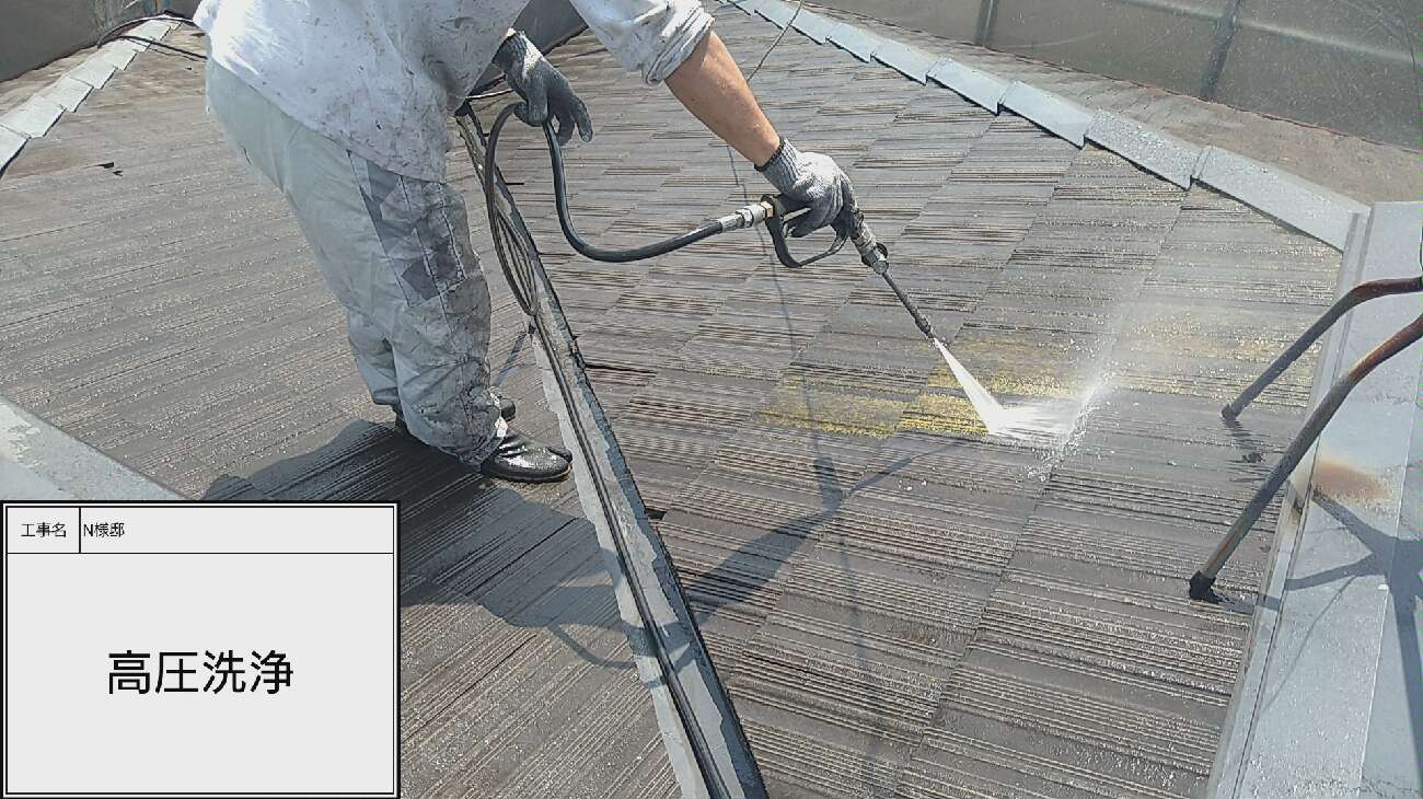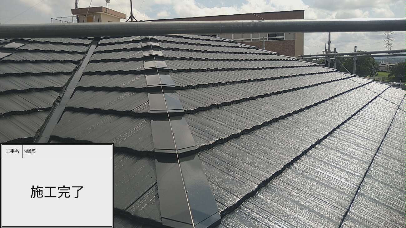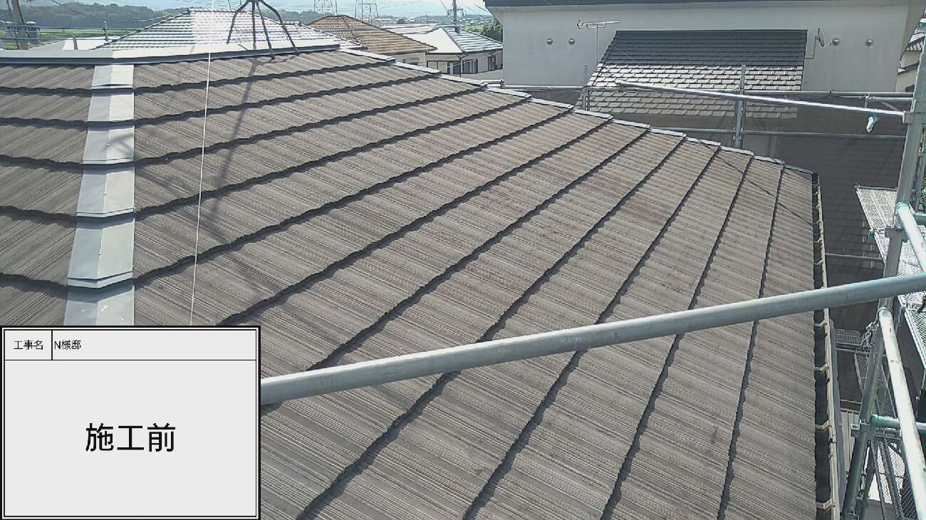 まずは専用下塗り材を塗布していきます。今回N様邸のお屋根の基材になっているモニエル瓦は塗料を吸い込みやすい基材の為、劣化状況にによっては下塗りを数度重ねたり、塗料の吸い込みを押さえる工程を入れることもあります。