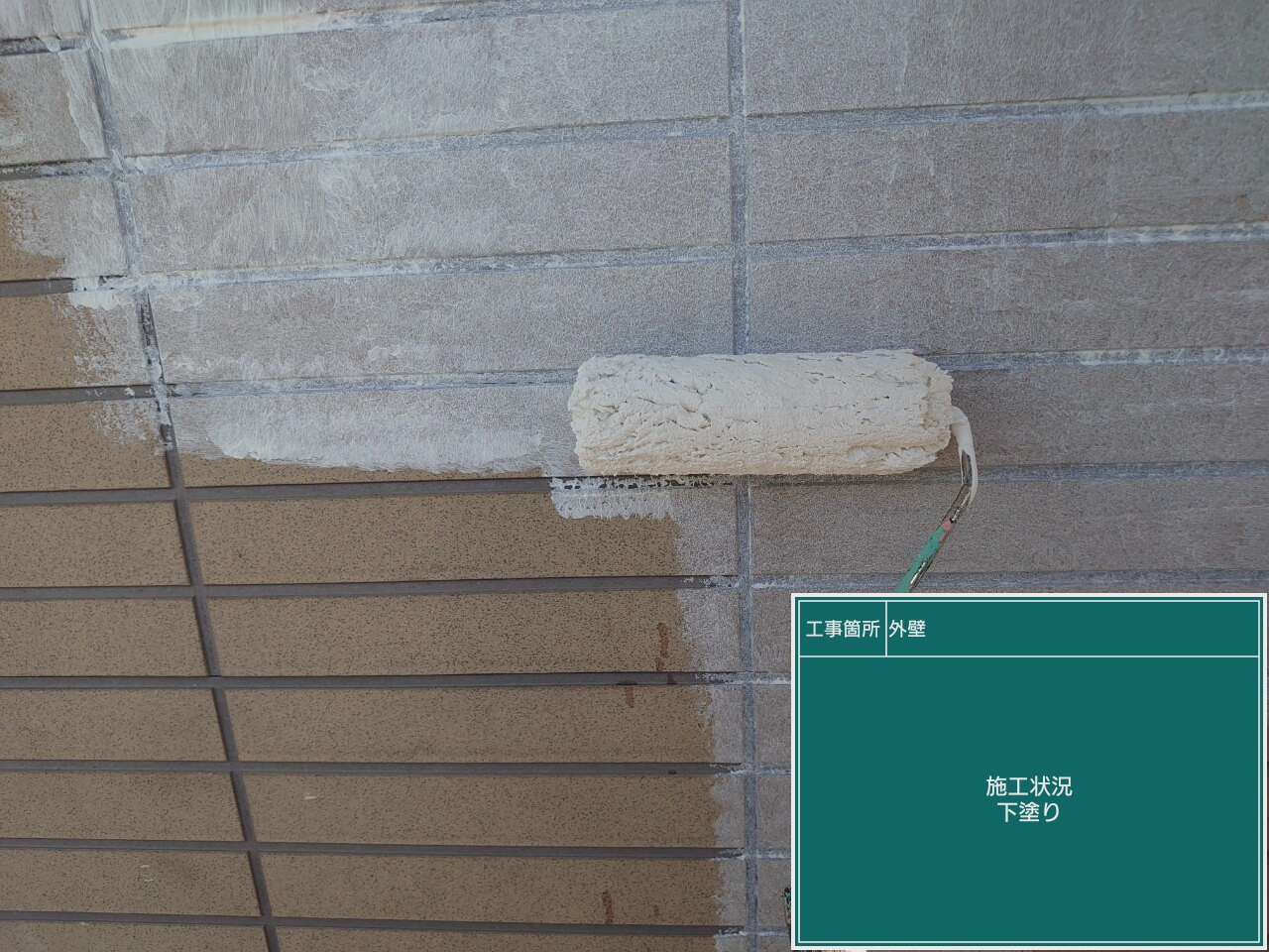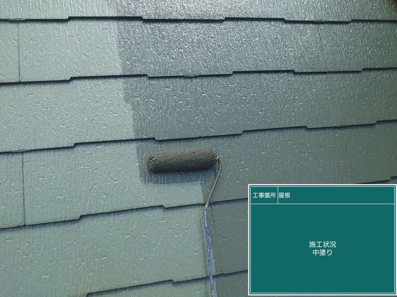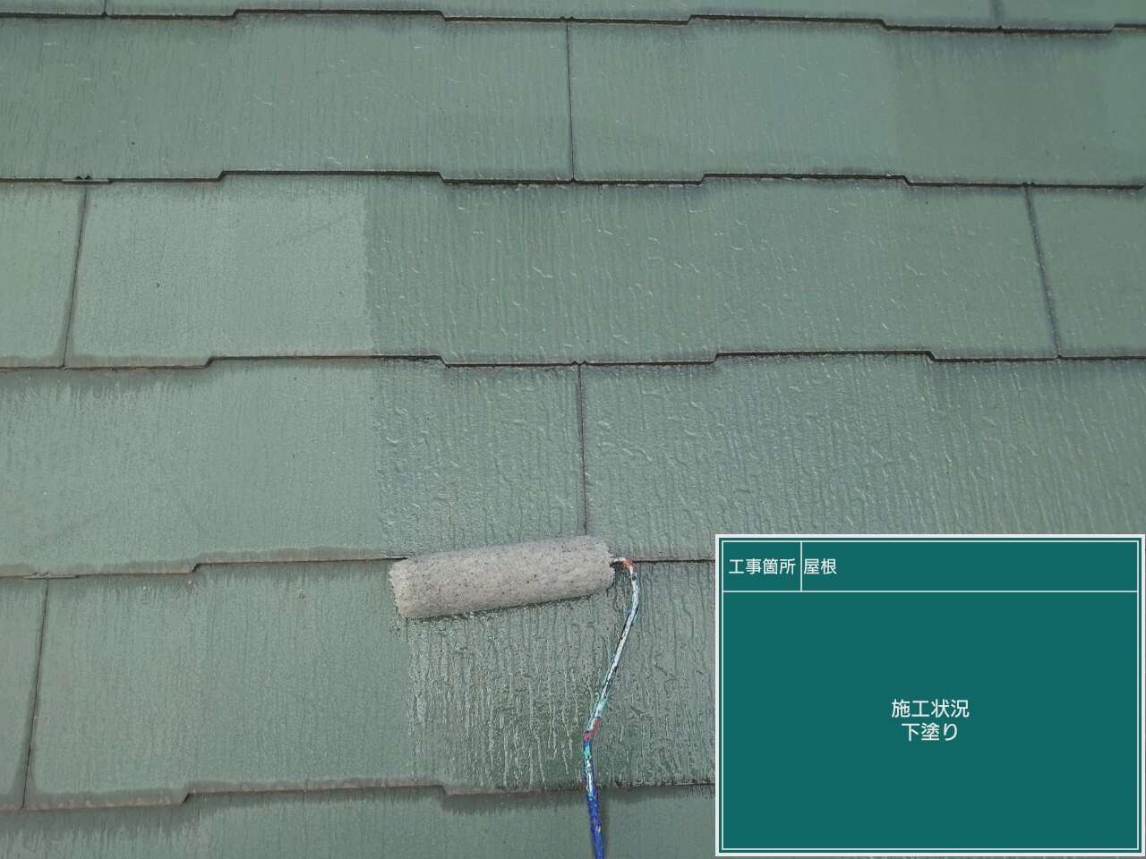 屋根の下塗り塗装作業です。下塗りでは上塗りの塗料の密着を高める役割があります。