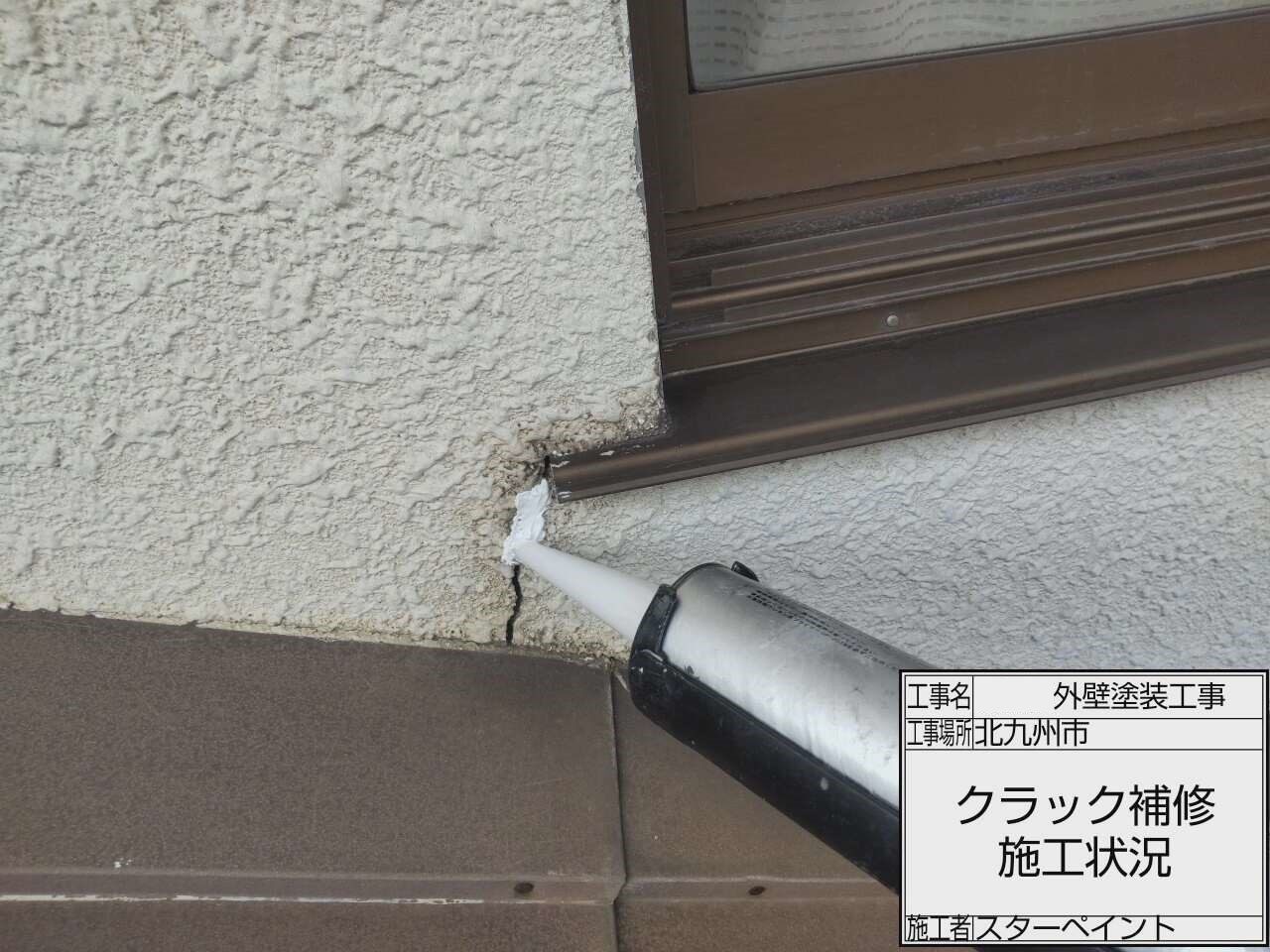 次に外壁のクラック(ひび)を補修していきます。補修をしてから塗装を行うことでヒビを埋めることが出来見た目もなじんできます。