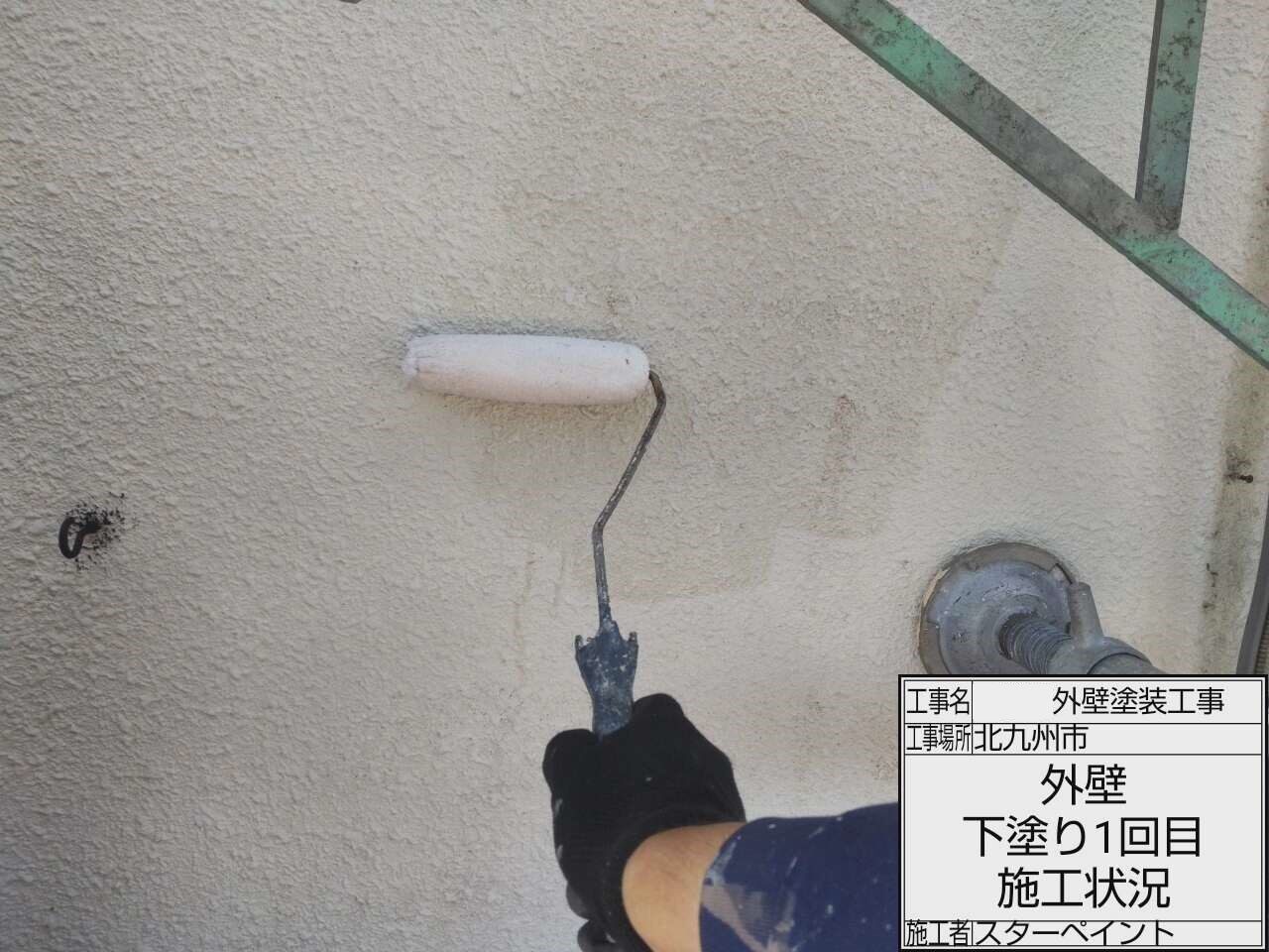 次に塗装作業に入ります。塗装作業は下塗り塗装作業から行いますが、今回は外壁の下塗りは2回行います。こちらの写真は1回目の下塗り作業の写真になります。