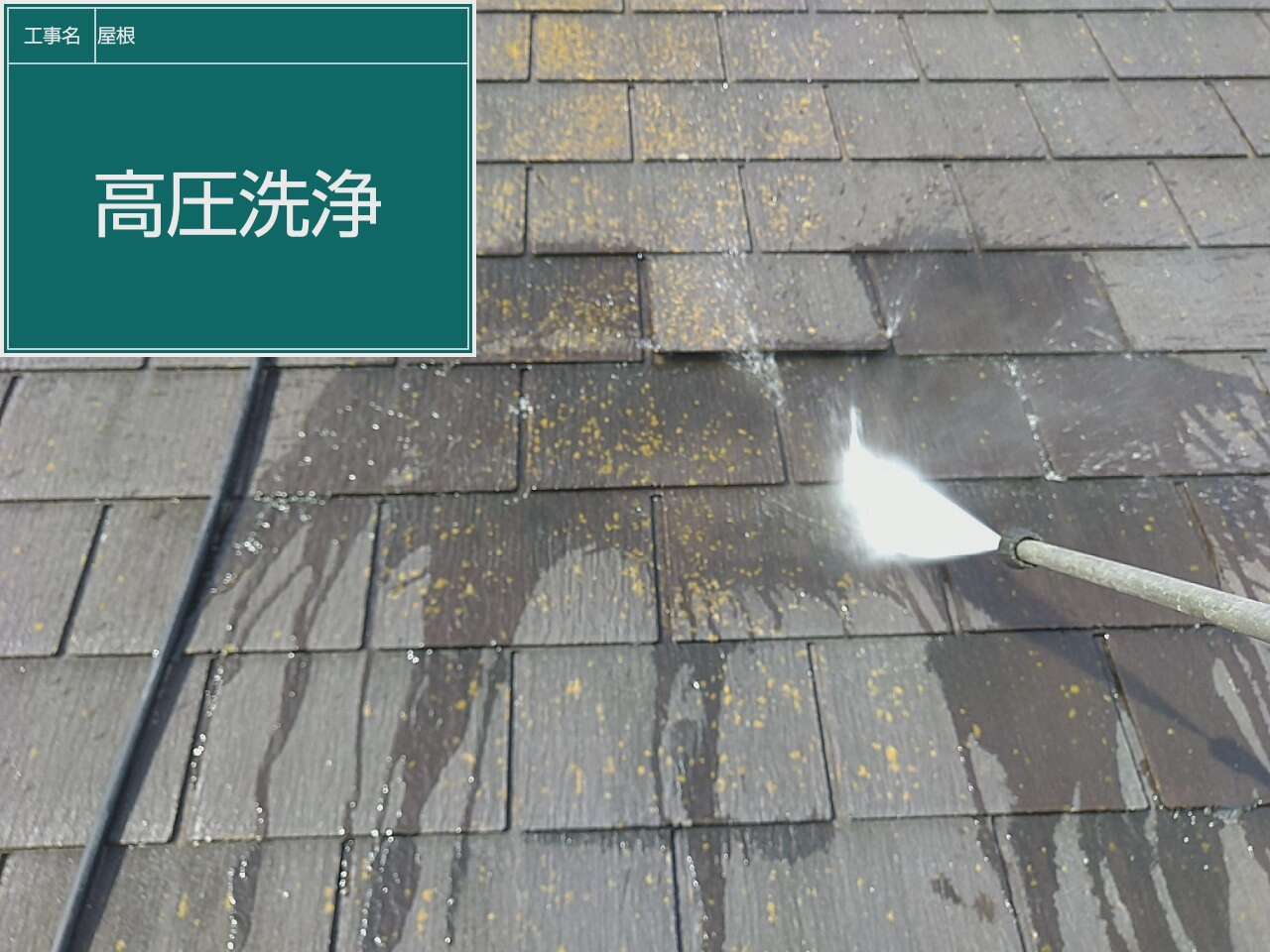 屋根の洗浄作業を行います。屋根の汚れを高圧洗浄にてきれいにしていきます。
