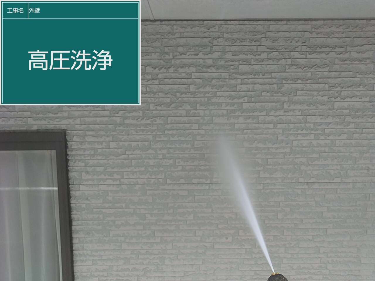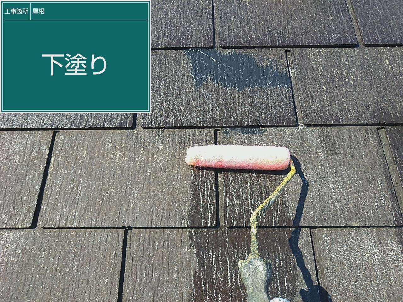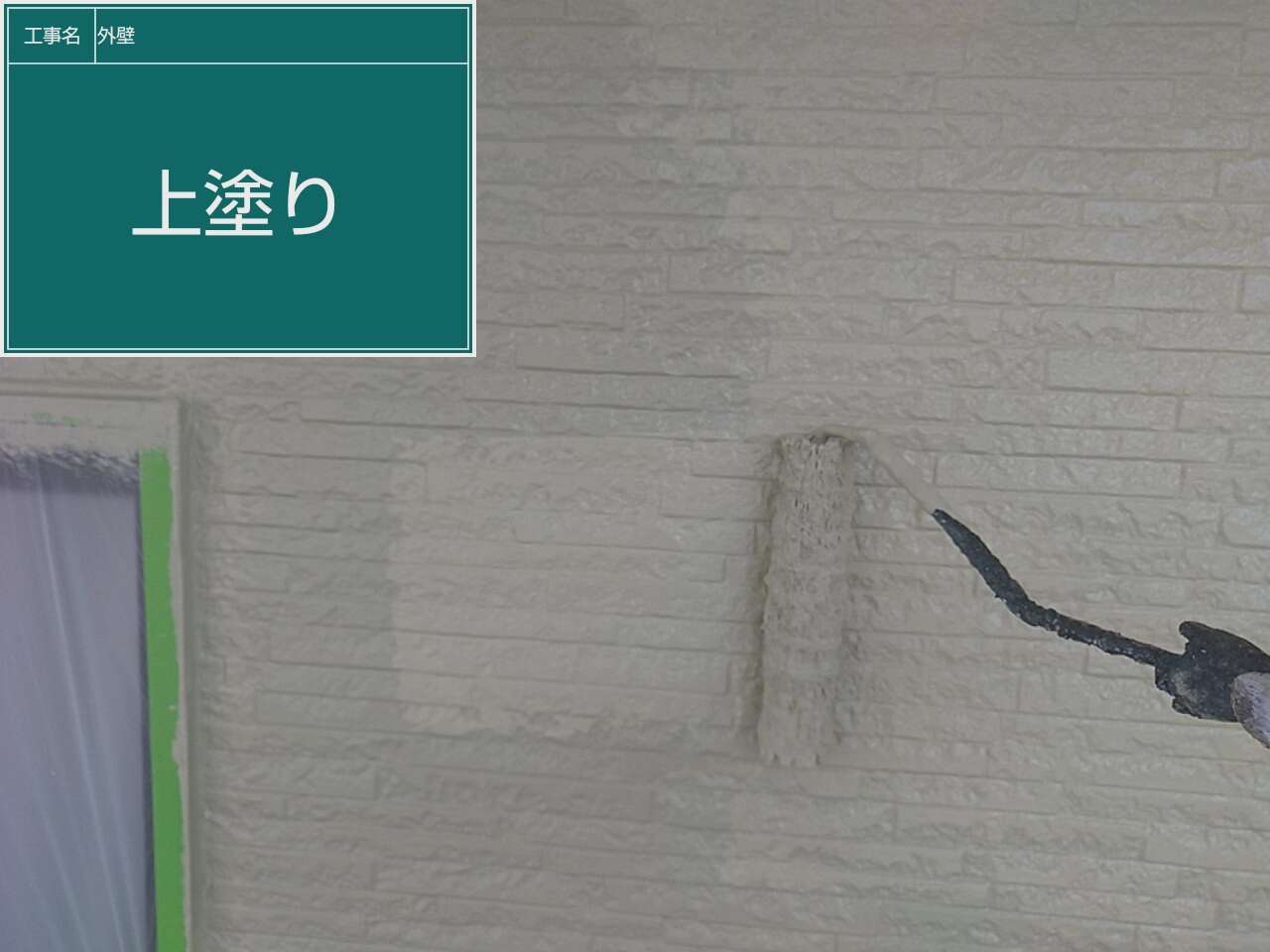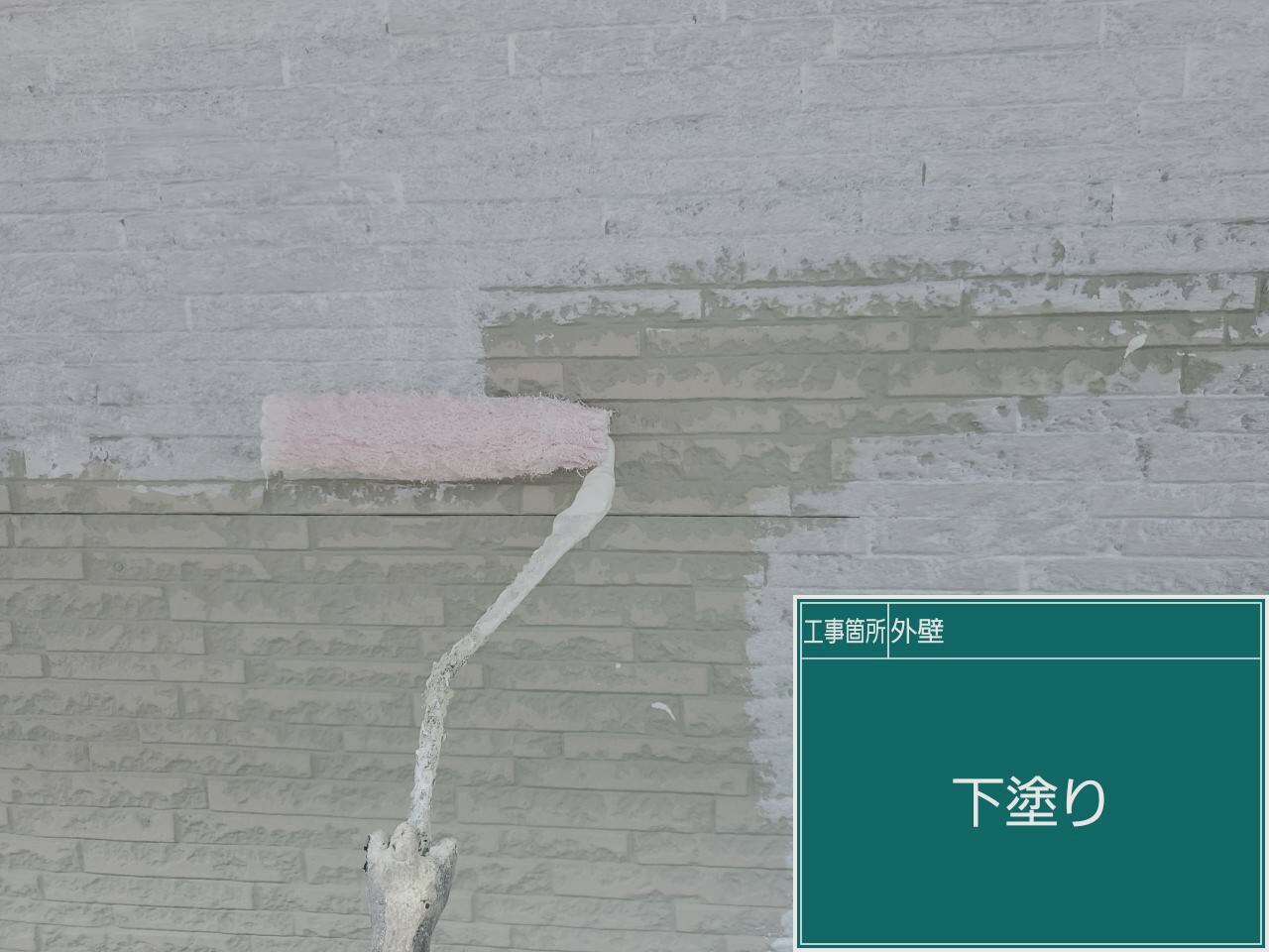 外壁の塗装を紹介していきます。外壁塗装の工程は下塗り・中塗り・上塗りの順に塗装を行います。 こちらは下塗り塗装の作業様子です。下塗りで密着性を高めます。