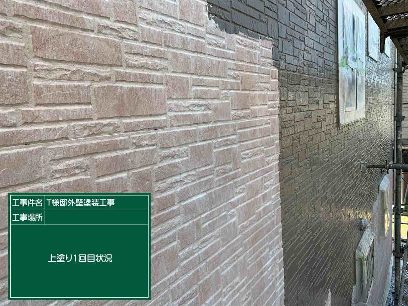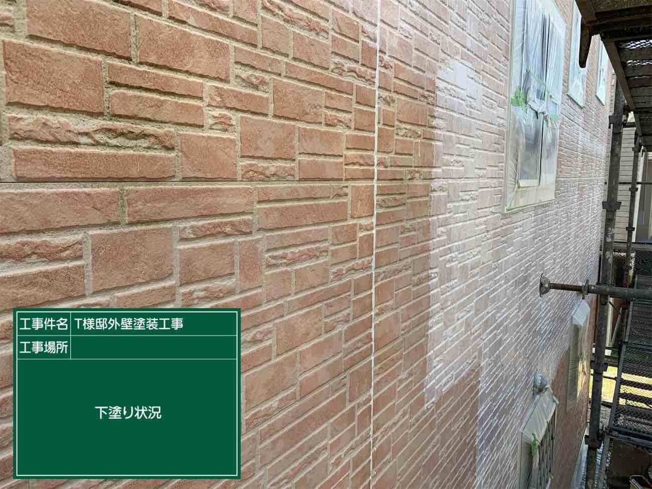 外壁の下塗り塗装作業です。下塗りで上塗り塗料の密着性を高めます。