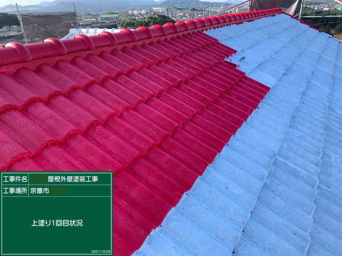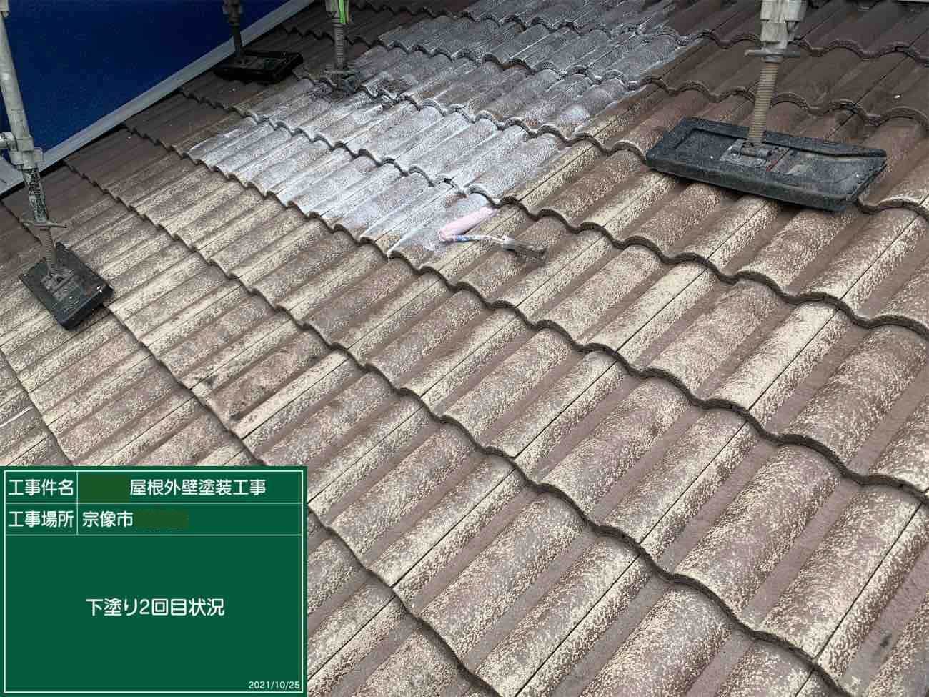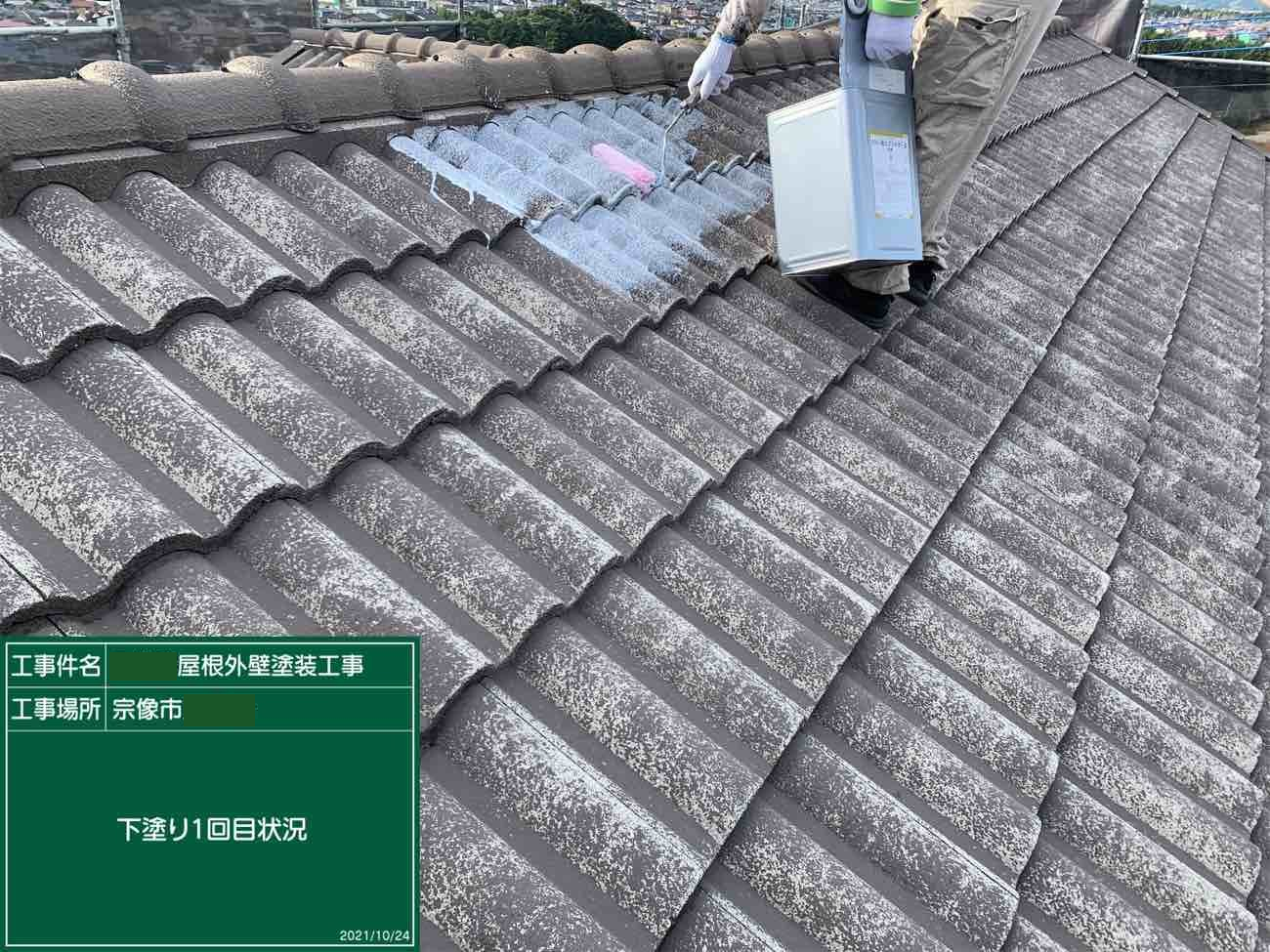屋根の下塗り塗装作業です。下塗りでは上塗りの塗料の密着を高める役割があります。