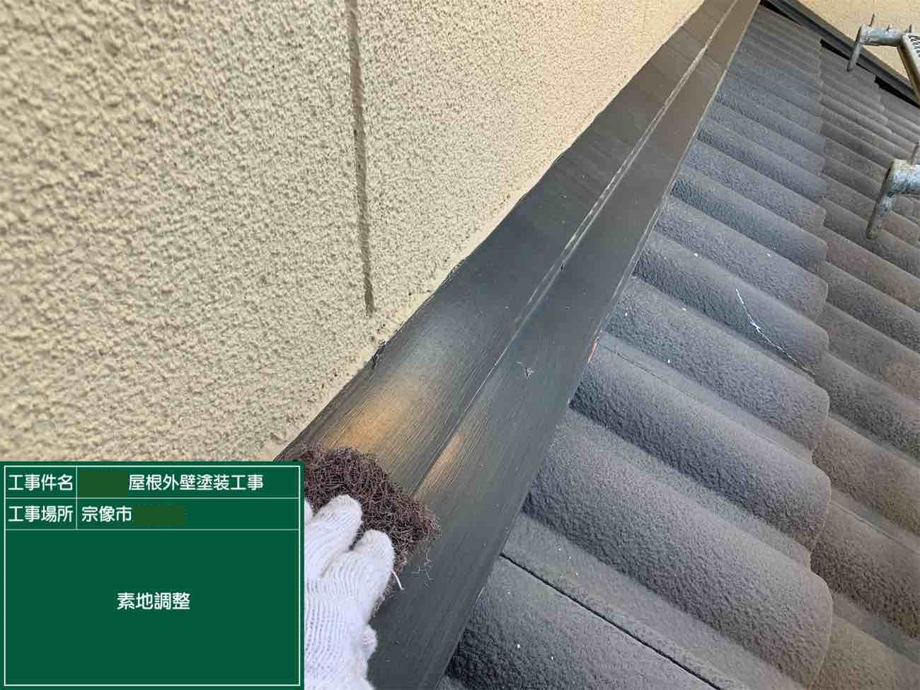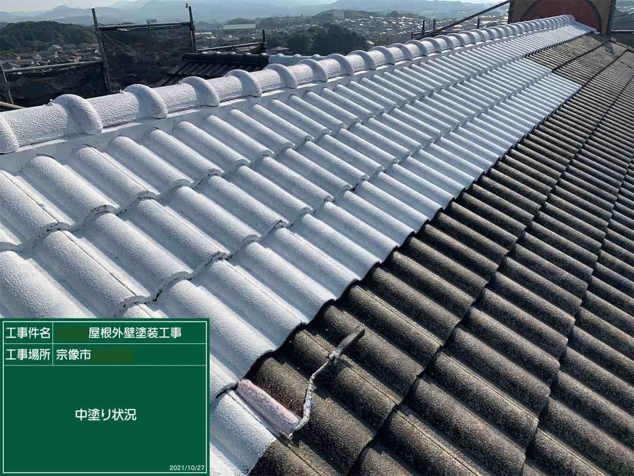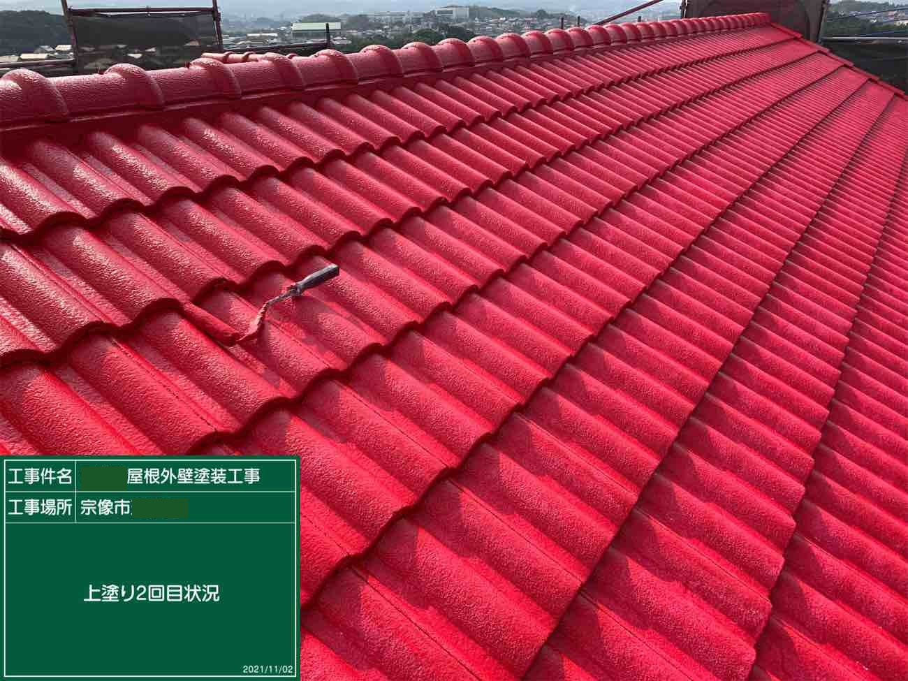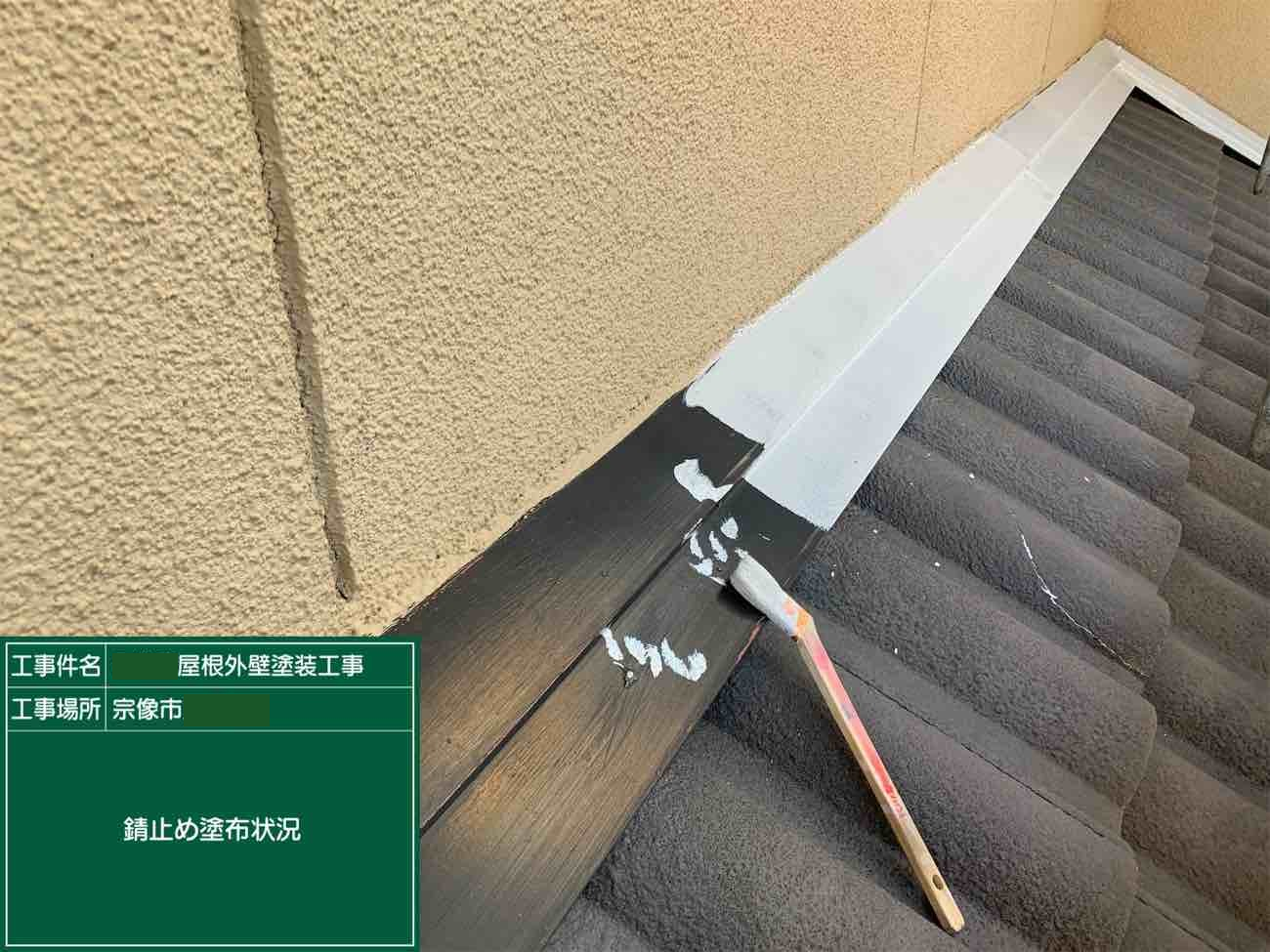 屋根の下塗り塗装作業です。下塗りでは上塗りの塗料の密着を高める役割があります。